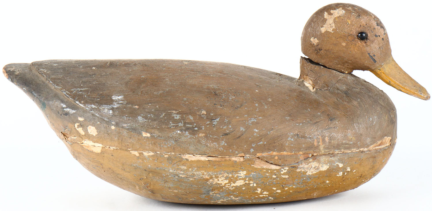 Mallard Hen by unknown maker, glass eyes, hollow wood, old hunter working repaint, neck is cracked. Grade: Very Good - Value: 20 to 40