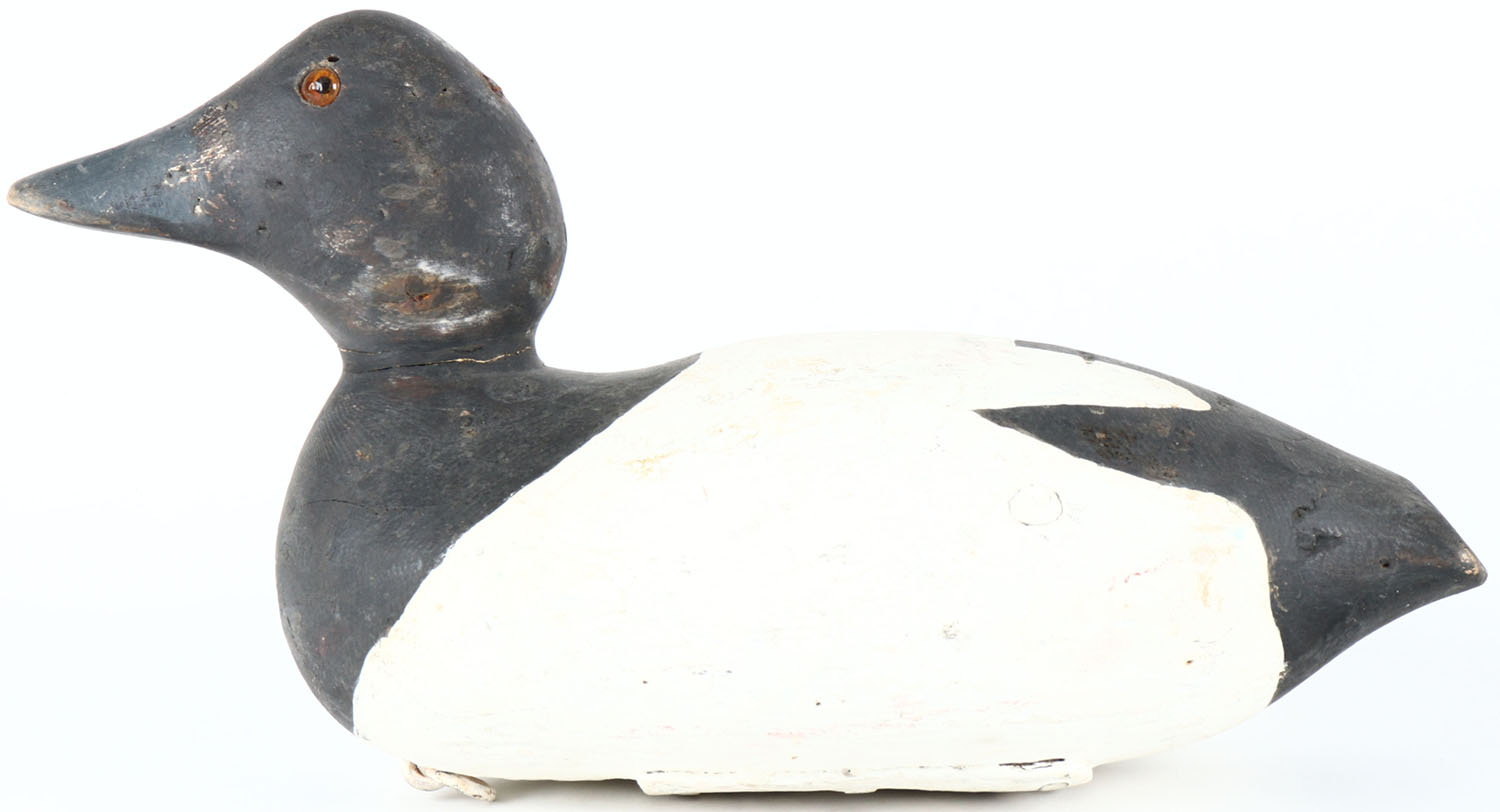 Bluebill Drake by Padco, Pascagoula, MS, glass eyes, solid wood, old hunter working repaint, has age cracks on bottom. Grade: Very Good ++ - Value: 20 to 40