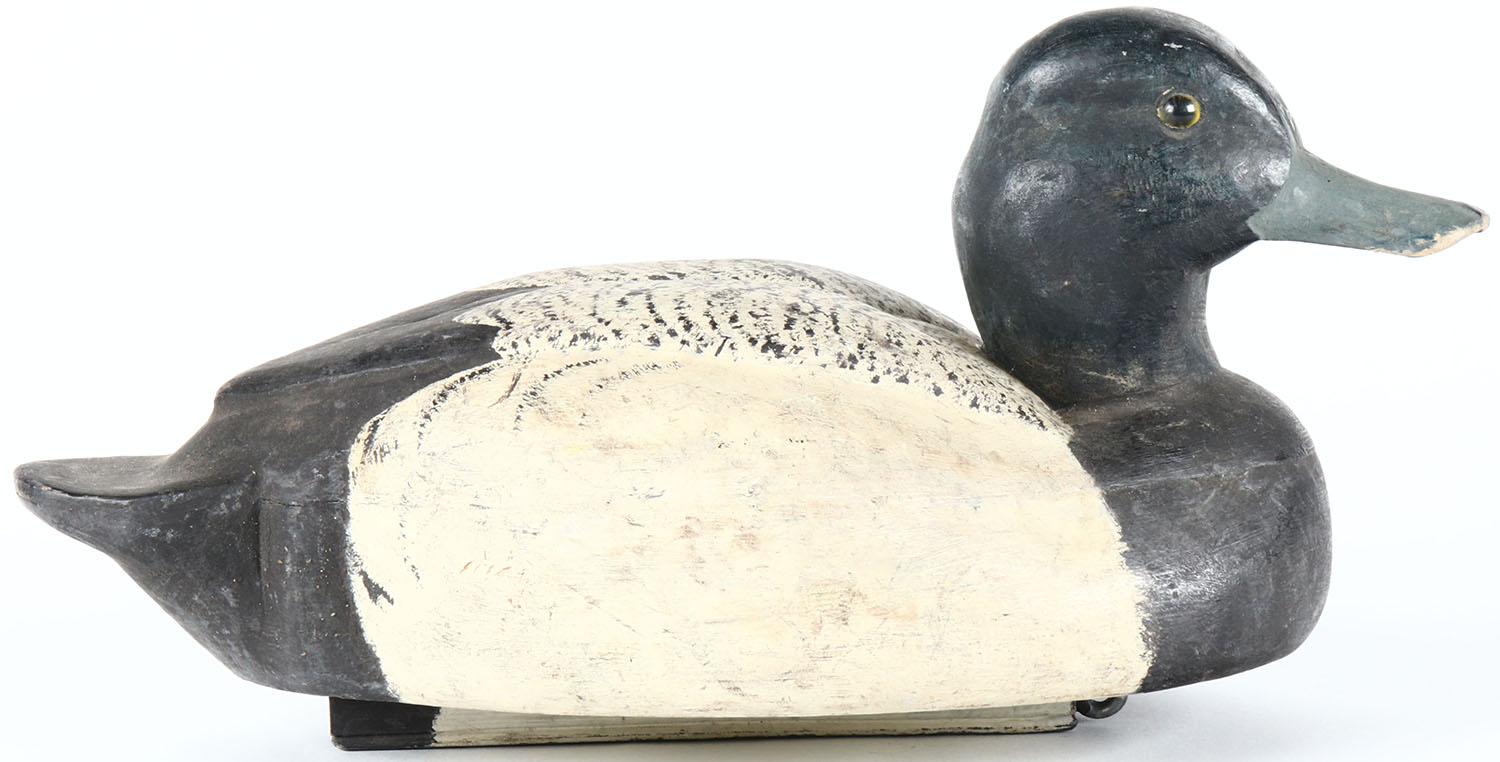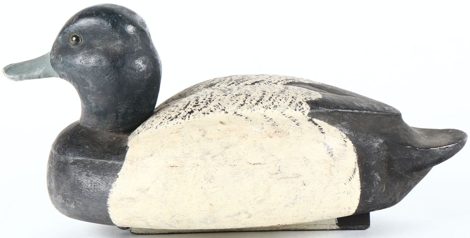 Bluebill Drake by unknown carver, glass eyes, hollow wood, original paint, structurally excellent, signed on bottom by maker. Grade: Excellent - Value: 50 to 100