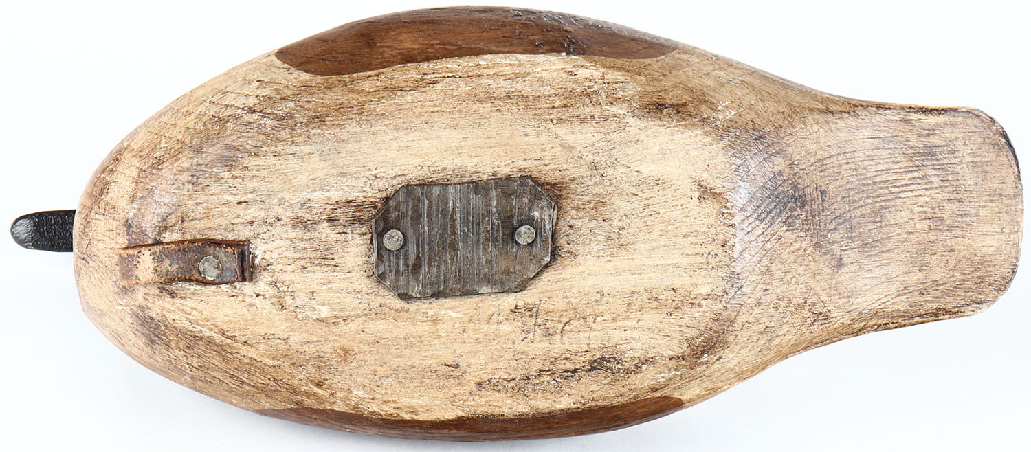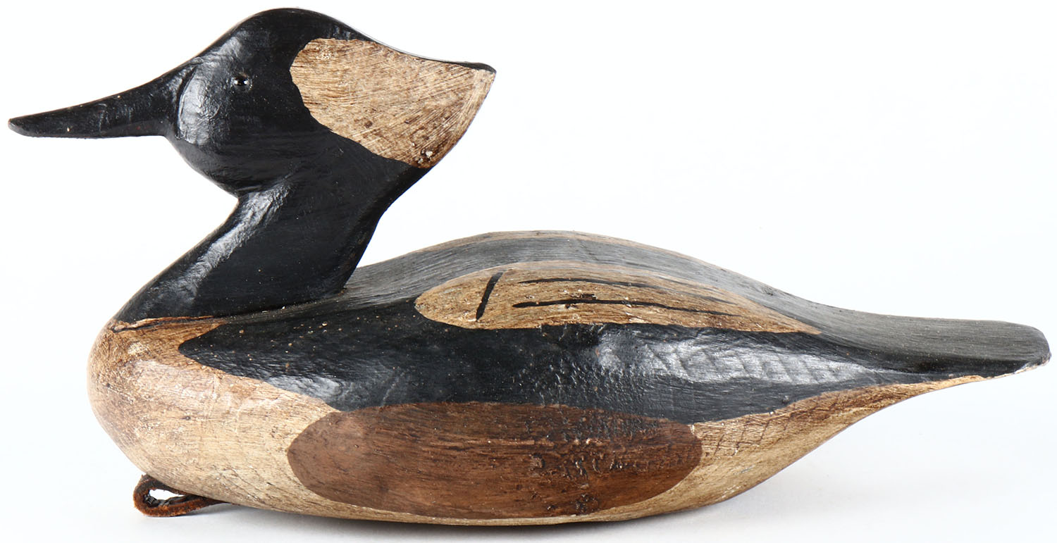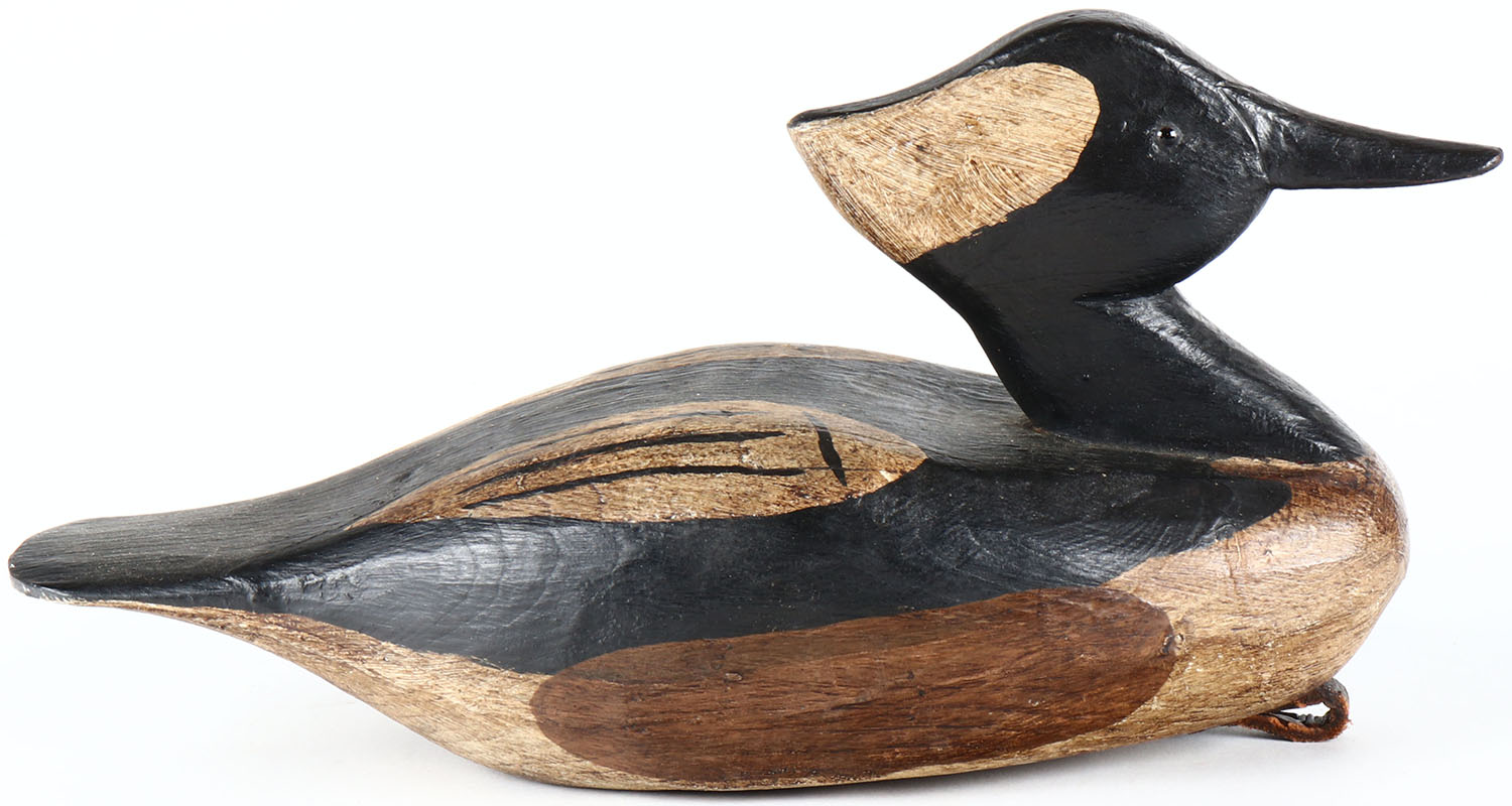 Hooded Merganser by unknown maker, glass eyes, solid wood, original aged paint, has age crack on back. Grade: Very Good + - Value: 30 to 60