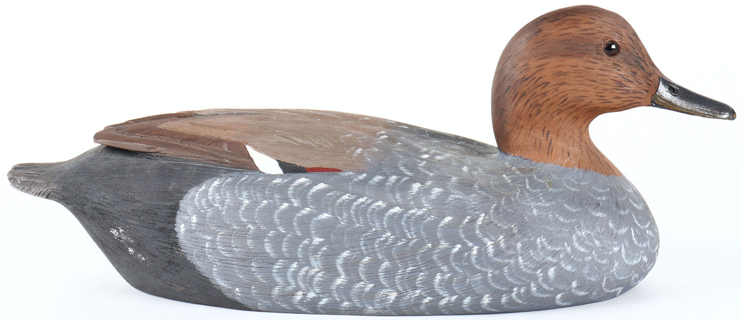 Gadwall Drake by Ed Cassedy, Monkton, Maryland, glass eyes, solid wood, original paint, structurally excellent, signed on bottom. Grade: MINT - Value: 40 to 80