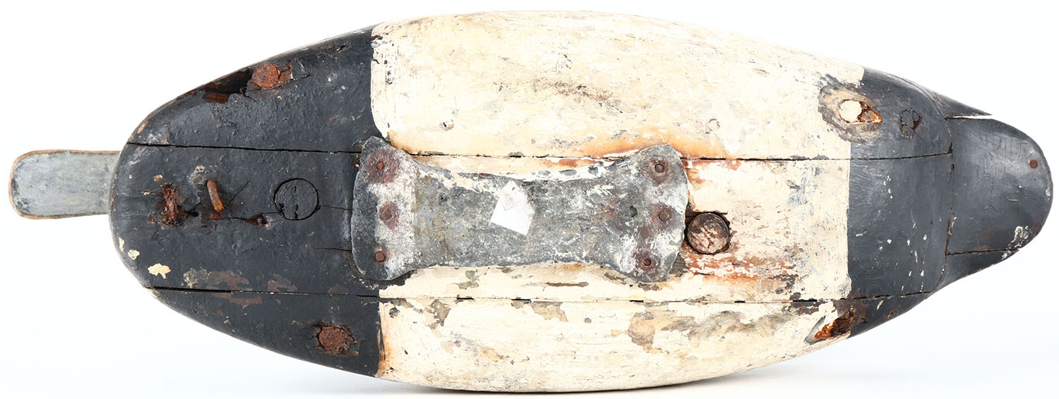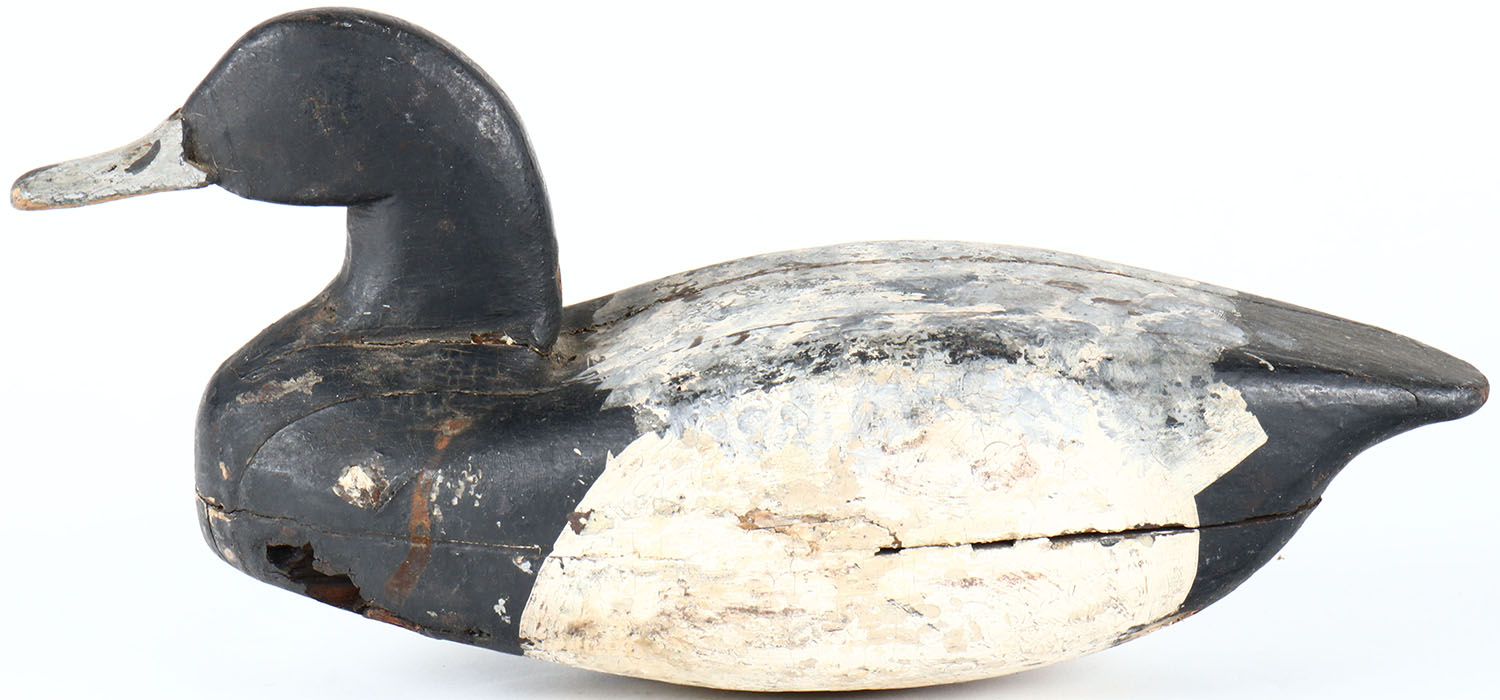Bluebill Drake by unknown maker, no eyes, solid wood, old hunter working repaint, has age cracks on entire body. Grade: Very Good - Value: 40 to 80