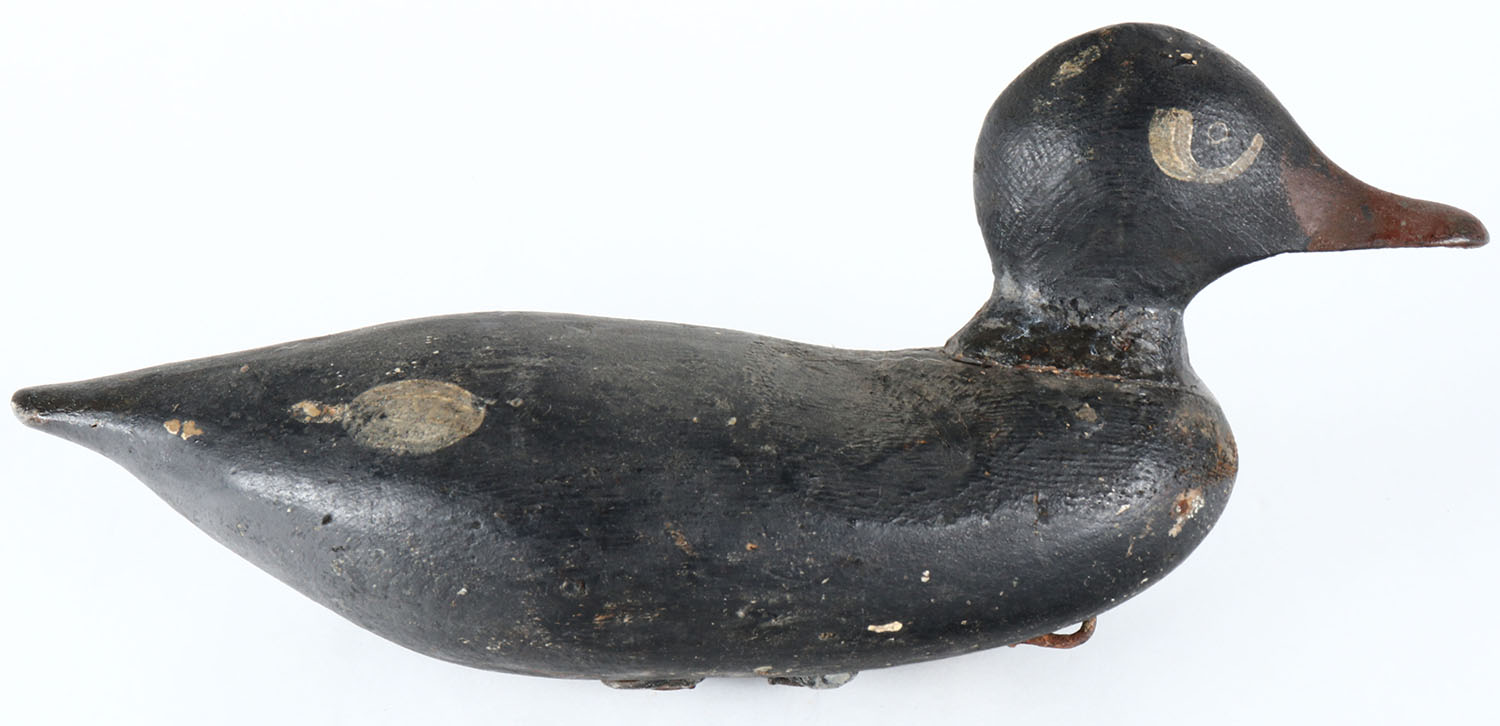 Scoter by unknown New England maker, painted eyes, solid wood, combination of original and hunter working touch-up, has age cracks on bottom, head has chips in it. Grade: Very Good + - Value: 80 to 150