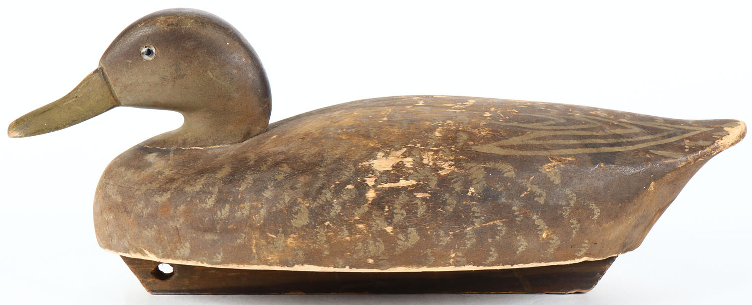 Black Duck by Wildfowler Decoys Old Saybrook, CT, glass eyes, solid balsa wood, original paint, structurally excellent, WILDFOWLER DECOYS brand on bottom. Grade: Very Good