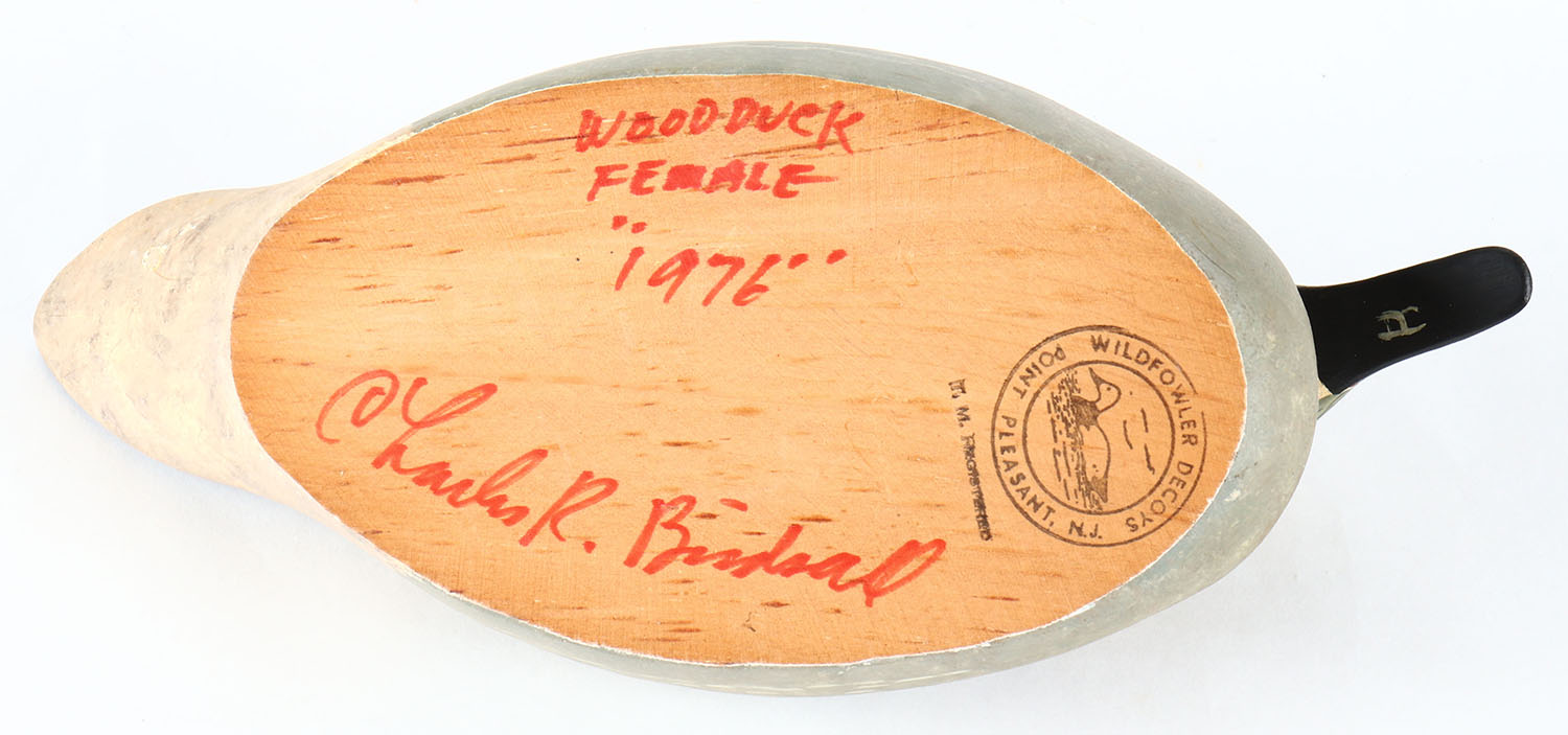 Woodduck Hen by Wildfowler Decoys, Point Pleasant NJ, glass eyes, solid wood, original paint, structurally excellent, branded by WILDFOWLER DECOYS on bottom. Grade: Excellent + - Value: 30 to 60