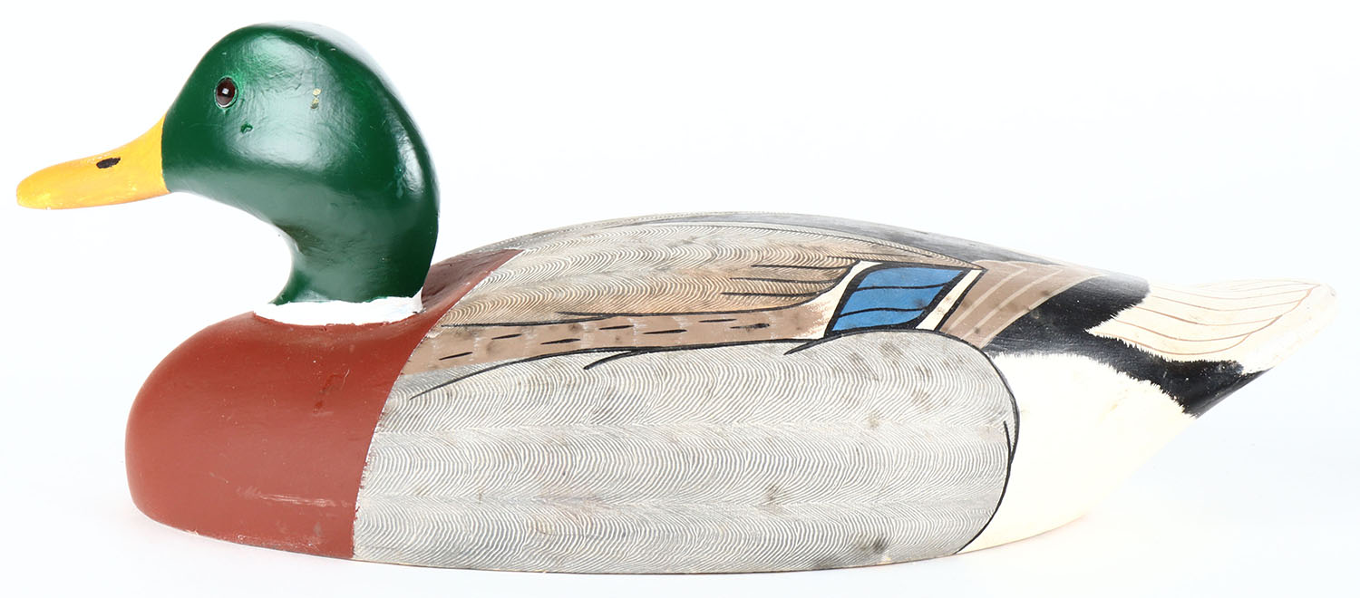 Mallard Drake by Wildfowler Decoys Babylon NY, glass eyes, solid wood, original paint with comb painting, structurally excellent, branded by WILDFOWLER DECOYS on bottom. Grade: Excellent ++ - Value: 30 to 60