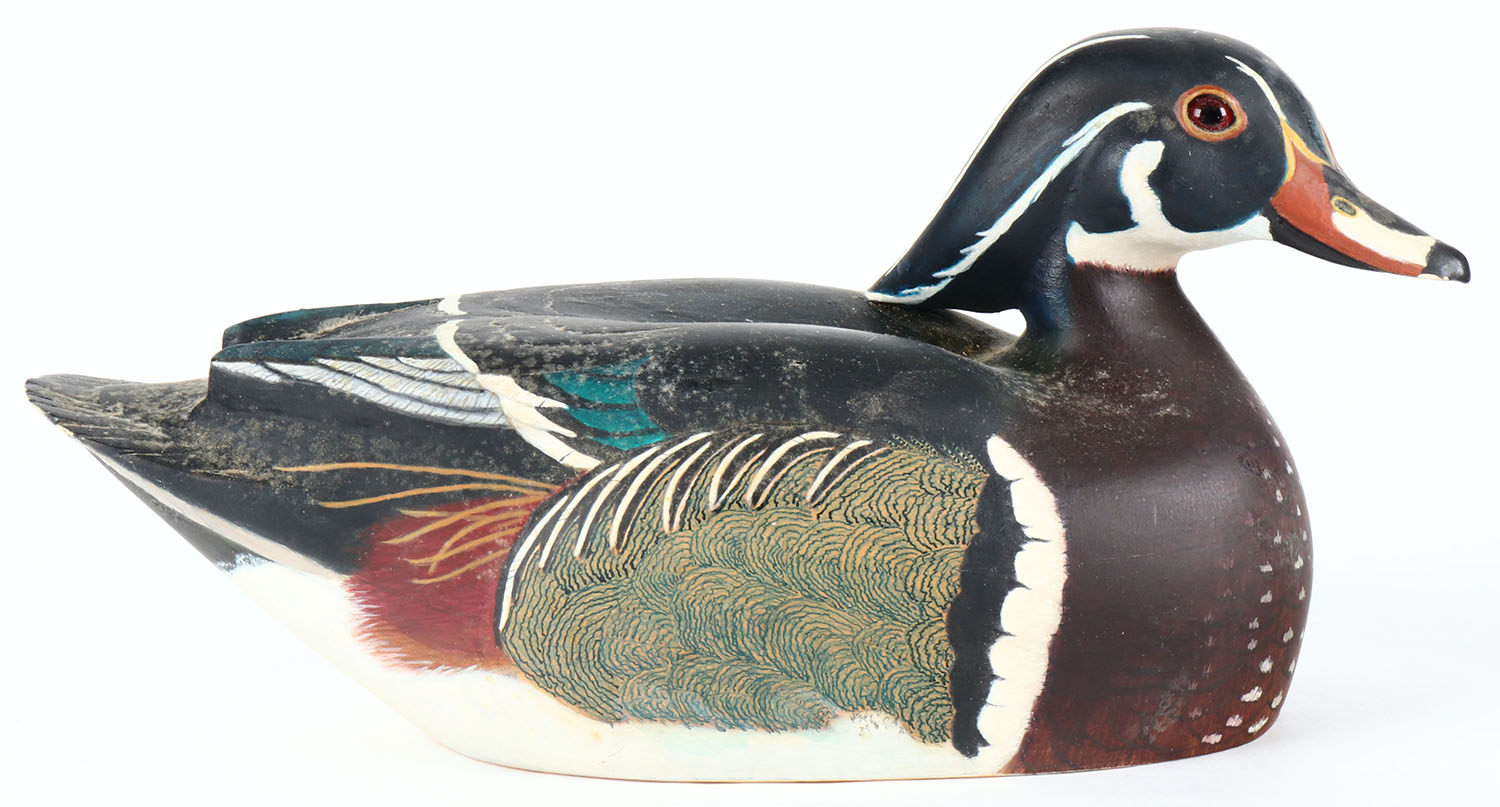 Woodduck Drake by Bob Schwartz, Calgary, Canada, Glass eyes, hollow wood, original paint, with combing, structurally excellent, signed on bottom by maker. Grade: Excellent - Value: 40 to 80