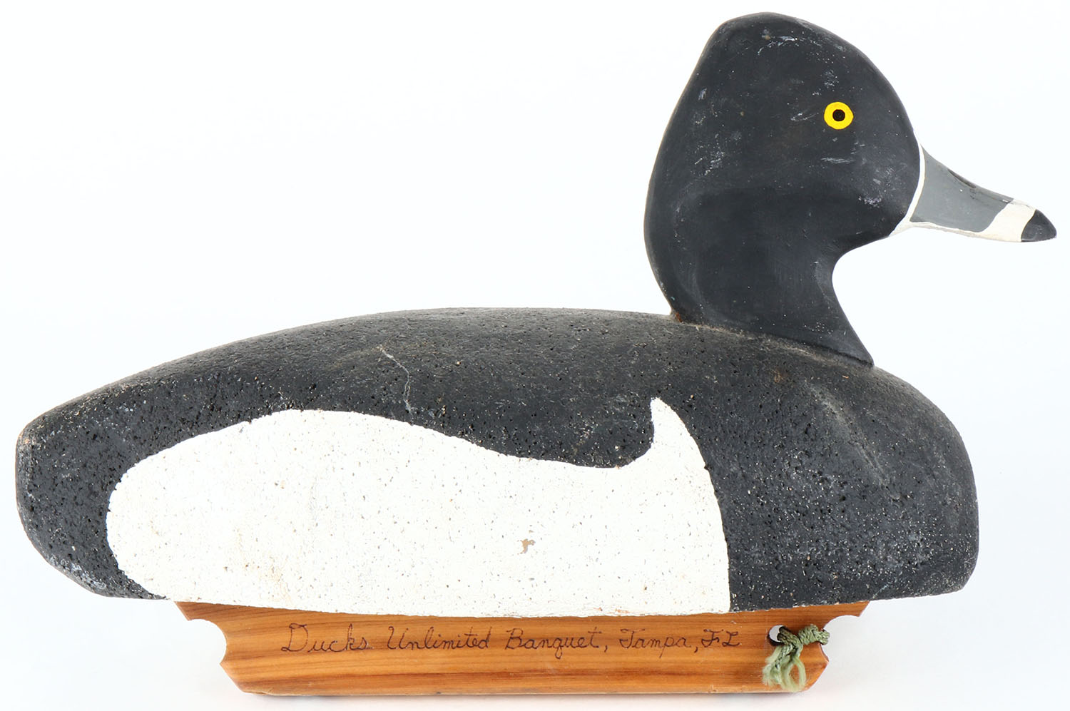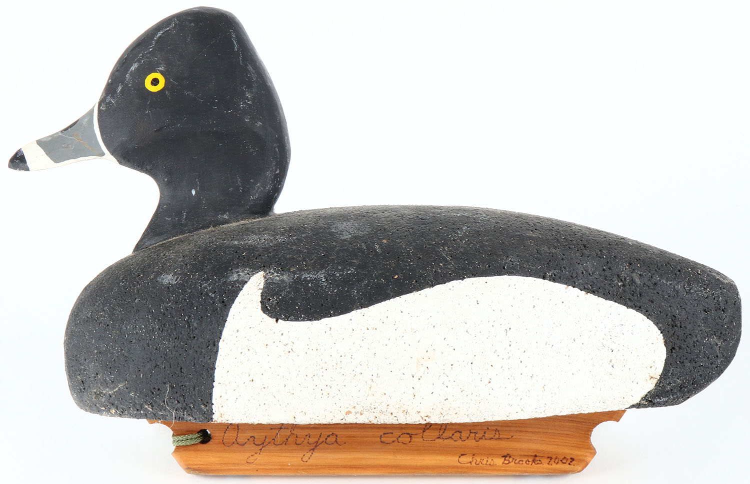 Ring-Neck Drake by Chris Brooks, painted eyes, solid cork body on wood stand, original paint, structurally excellent. Grade: Excellent - Value: 30 to 60