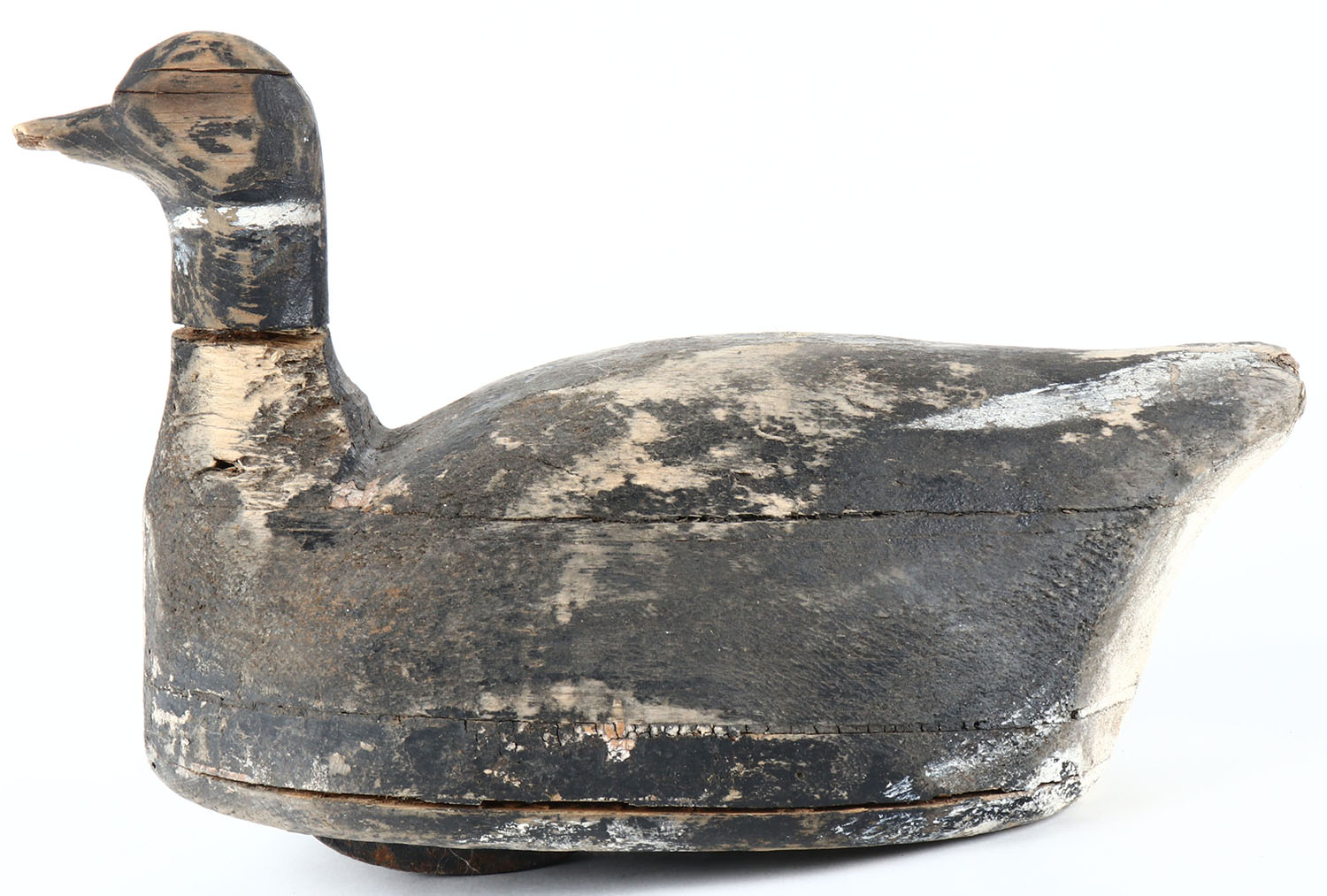 Black Brant by unknown maker, no eyes, solid wood, original paint, head is loose, has age cracks on entire body. Grade: Very Good - Value: 50 to 100