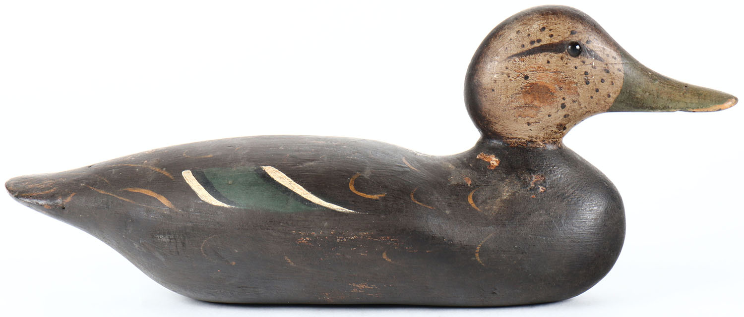 Standard Black Duckk by Mason Decoy Company, Detroit, MI, 1896-1924, glass eyes, solid wood, compete repaint, has age crack on bottom. Grade: Very Good - Value: 40 to 80