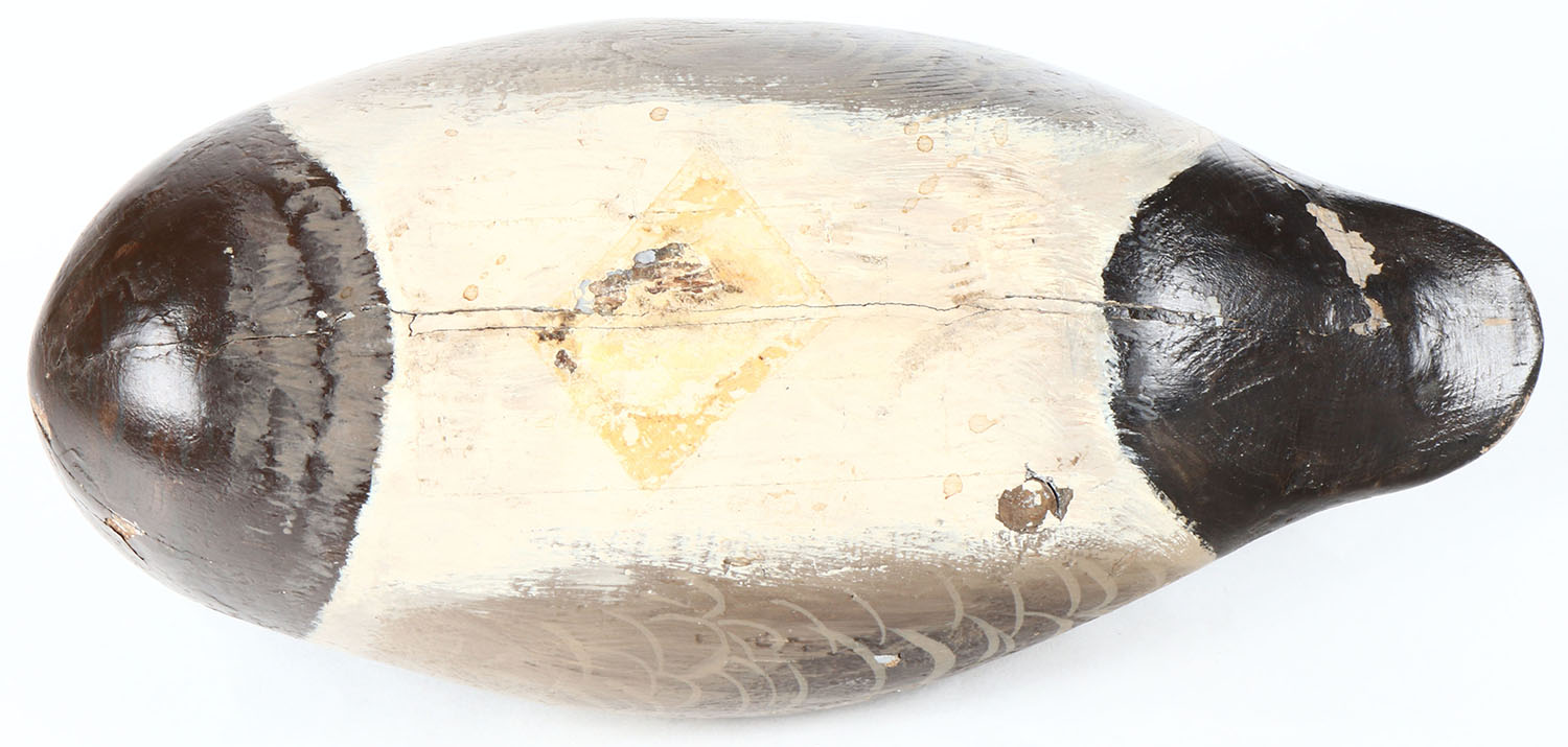 Preening Bluebill Hen by unknown maker, glass eyes, solid wood, original paint with overpaint on old neck repair, has age cracks on bottom and back. Grade: Very Good + - Value: 20 to 40