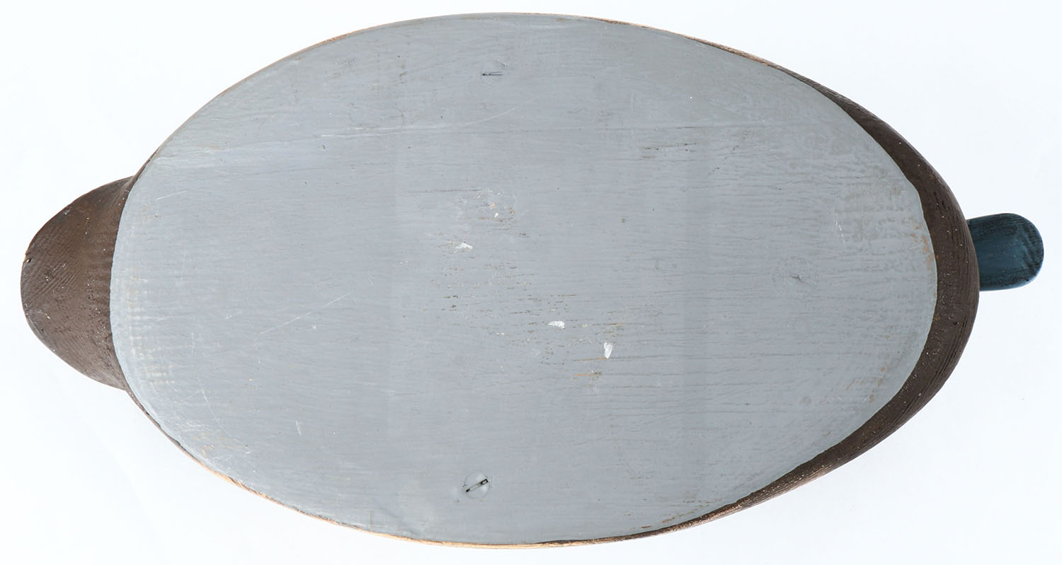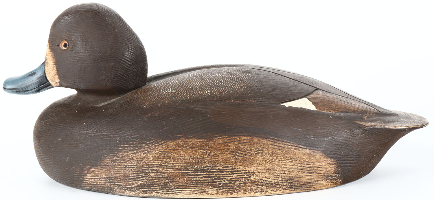 Bluebill Hen by Ontario, Canada maker - possibly Ken Anger, glass eyes, hollow wood, original paint, structurally excellent. Grade: Excellent - Value: 200 to 300