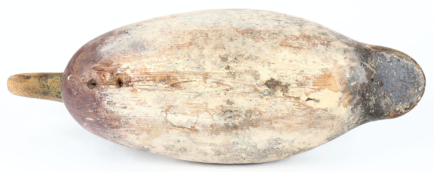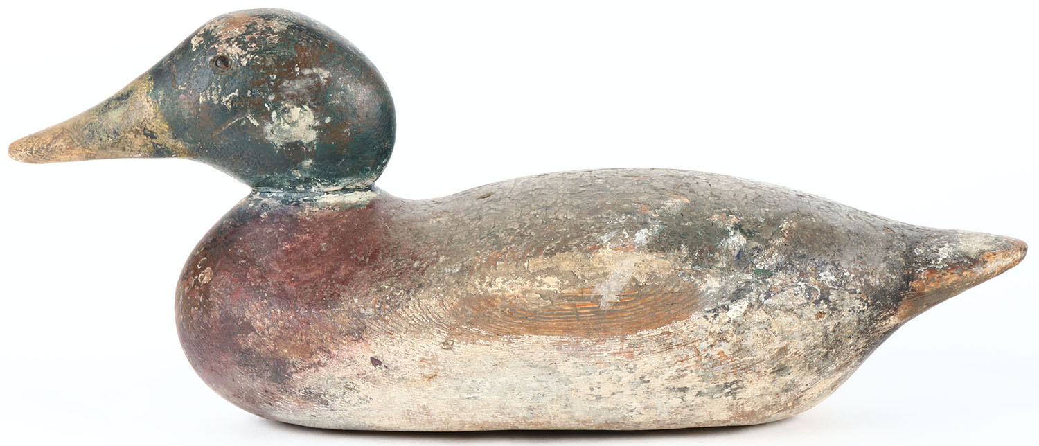 Standard Mallard Drake by Mason Decoy Company, Detroit, MI, 1896-1924, glass eyes, solid wood, combination of original paint and overpaint, has age cracks on back and bottom. Grade: Very Good + - Value: 30 to 60