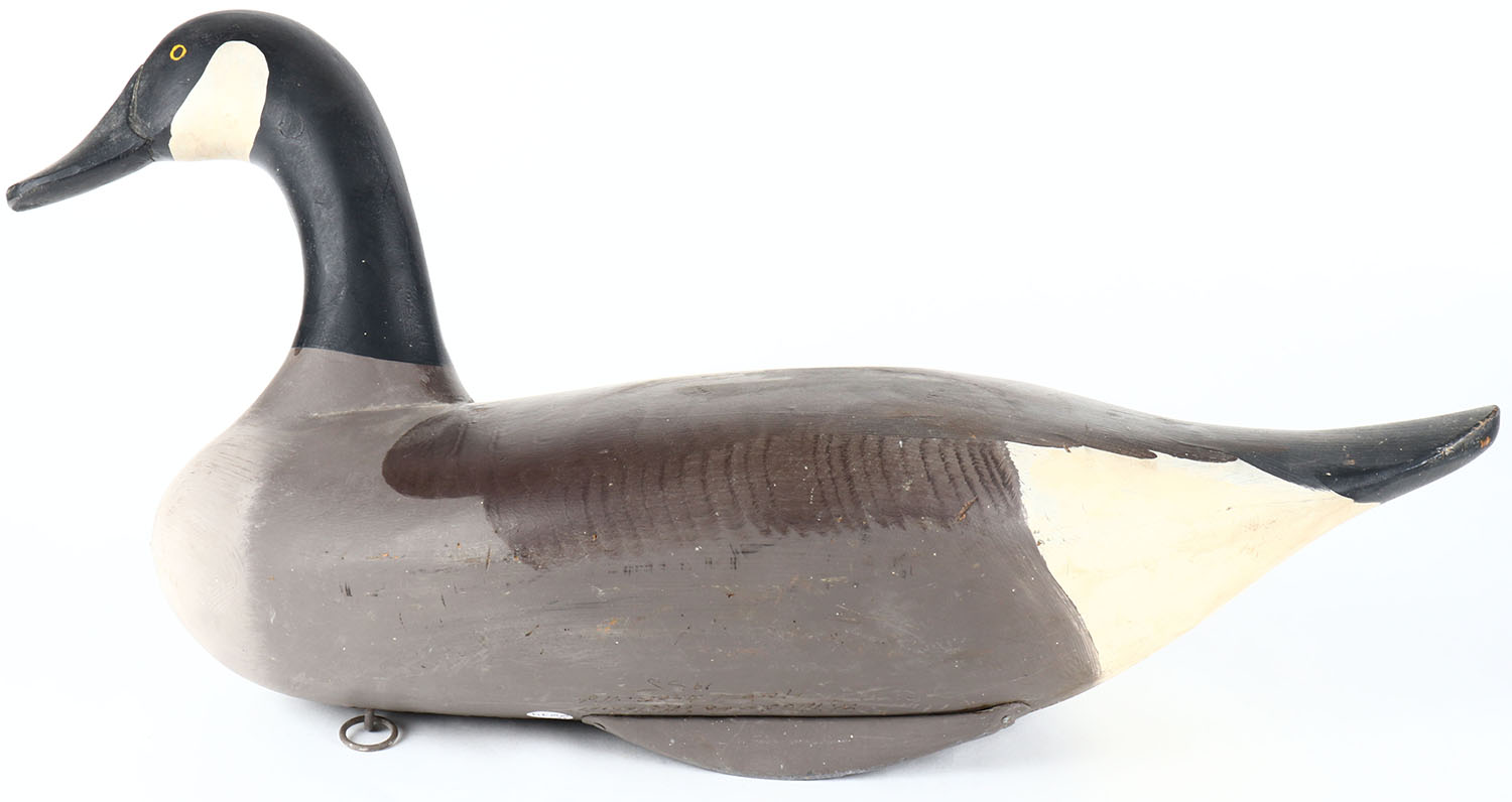 Canada Goose by R. Madison Mitchell, Havre de Grace, MD, solid wood, painted eyes, original paint, has age cracks on bottom and back, signed on bottom. Grade: Very Good ++ - Value: 100 to 300