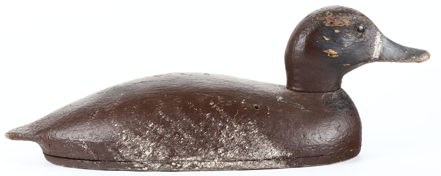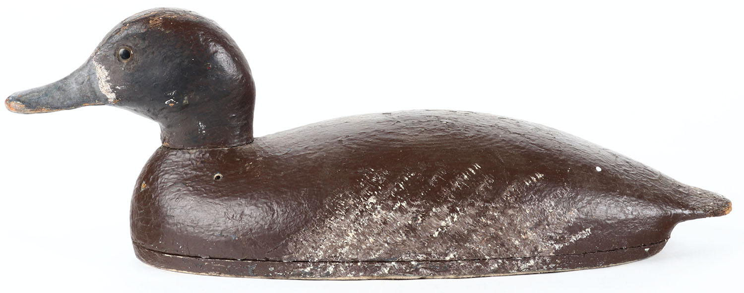 Bluebill Hen by unknown Toronto maker, glass eyes, hollow wood, old hunter repaint, structurally excellent. Grade: Very Good - Value: 40 to 80