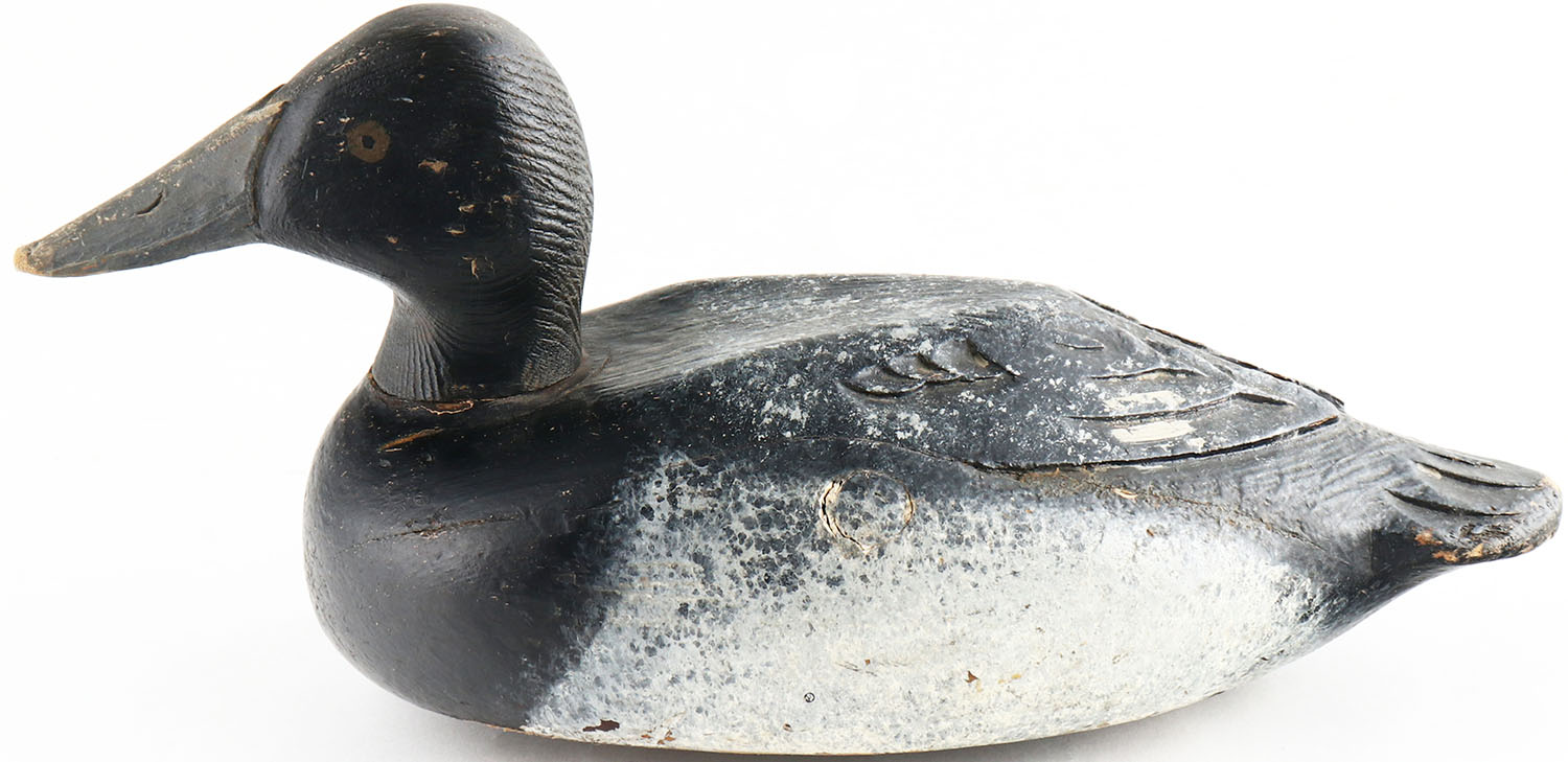 Canvasback Drake by unknown Wisconsin maker, painted eyes, solid wood, original paint, head is loose, has age cracks on back. Grade: Very Good - Value: 70 to 150