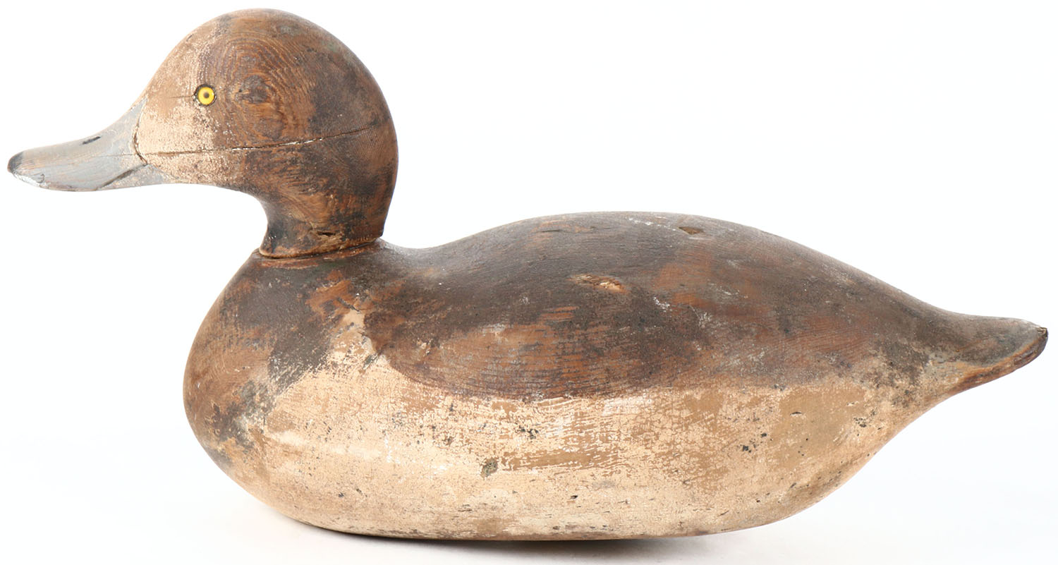 Challenge Bluebill Hen by Mason Decoy Company, Detroit, MI, 1896-1924. Glass eyes, solid wood, combination of old hunter strengthening with some original paint showing, has age cracks on bottom, tail is chipped. Grade: Very Good + - Value: 80 to 150
