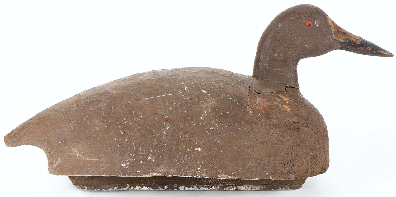 Canvasback Hen by unknown maker, tack eyes, solid wood, original paint, has age cracks on back, damage to the upper bill. Grade: Very Good + - Value: 20 to 40