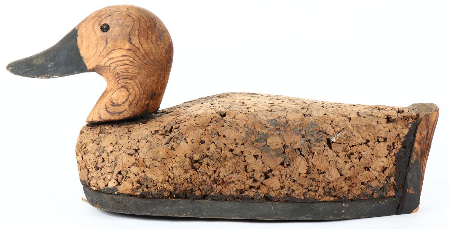 Canvasback Drake by unknown maker, glass eyes, solid cork body on wood base, head is loose. Grade: Very Good + - Value: 10 to 20