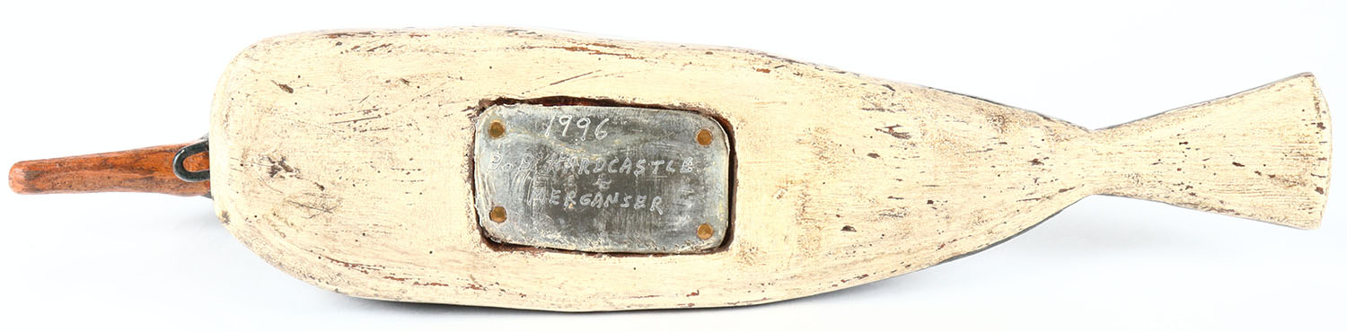 Merganser by Bob Hardcastle, tack eyes, solid wood, original paint distressed to appear old, structurally excellent, signed on bottom. Grade: Excellent + - Value: 50 to 100