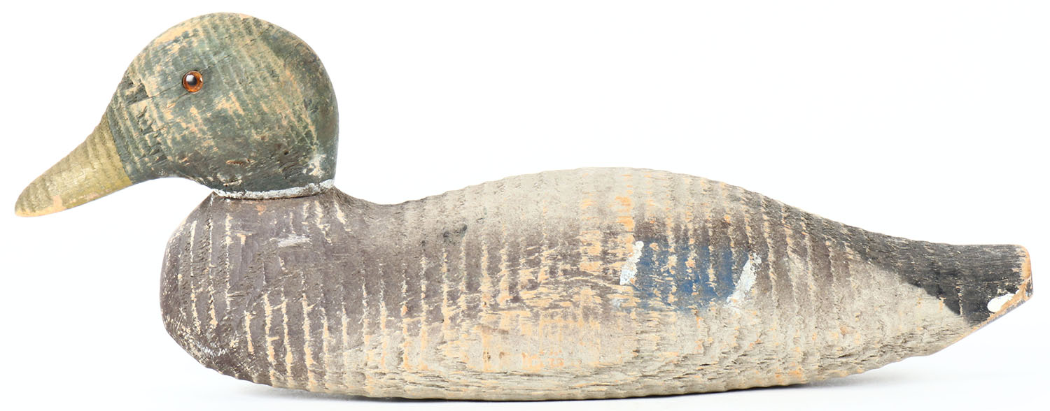 Mallard Drake by Victor Decoys, glass eyes, solid wood, original paint, structurally excellent, maker hard stamp on bottom. Grade: Very Good + - Value: 30 to 60