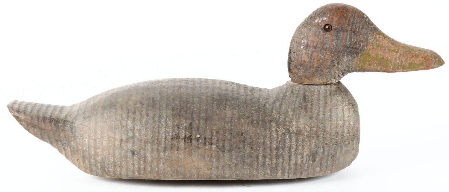 Black Duck by a Pascagoula, MS factory, glass eyes, solid wood, worn original paint, head is loose. Grade: Very Good + - Value: 10 to 30