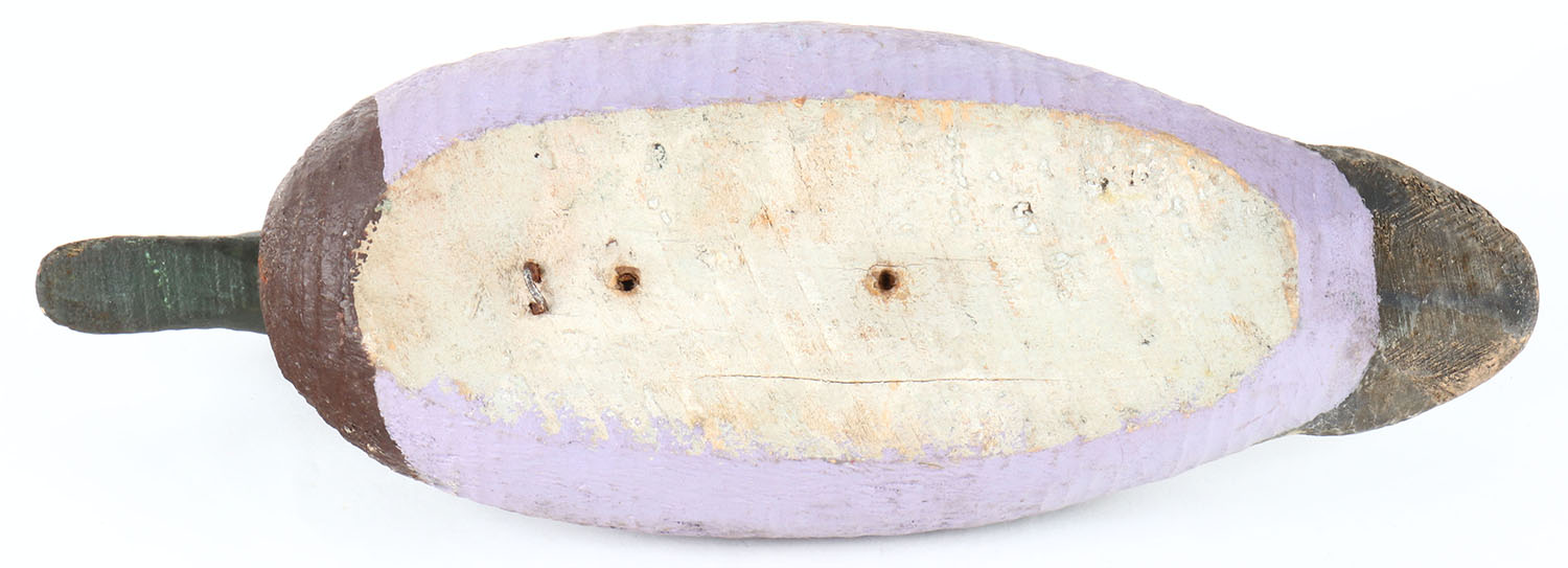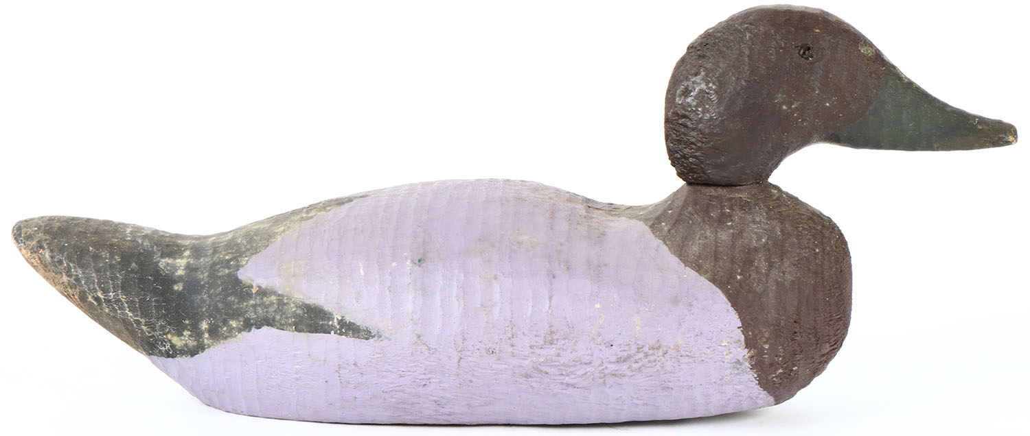 Canvasback drake by unknown factory, glass eyes, one eye is missing, old hunter repaint, has age cracks on bottom and on bill. Grade: Very Good - Value: 10 to 20
