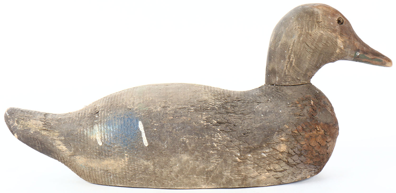 Mallard Hen by Animal Trap Company, Pascagoula, MS, eyes are missing, original paint with wear to the bear wood on the front of the decoy, head is loose. Grade: Very Good - Value: 10 to 30