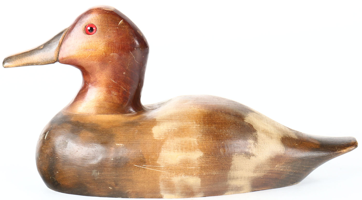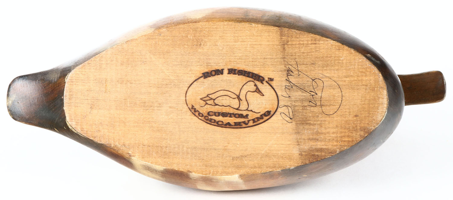 Canvasback Drake by Ron Fisher, glass eyes, solid wood, orginal paint, structurally excellent, signed and branded on bottom. Grade: Excellent ++ - Value: 20 to 60
