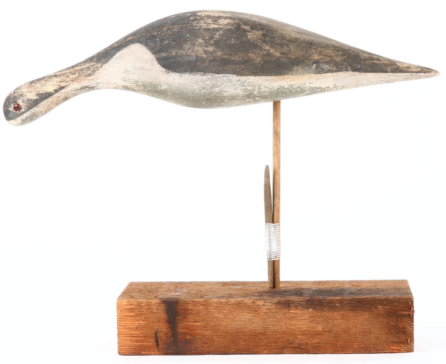 Shorebird by unknown maker, glass eyes, solid wood on wood stand, original paint, bill is attached to the stand. Grade: Very Good - Value: 40 to 80