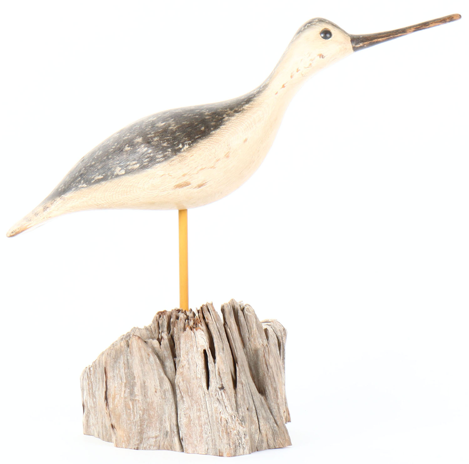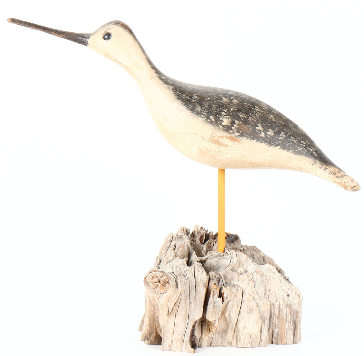 Shorebird by Greg Daisey, Chincoteague, Va, tack eyes, solid wood on wood stand, original paint, structurally excellent, signed and branded on bottom. Grade: Excellent ++ - Value: 30 to 60