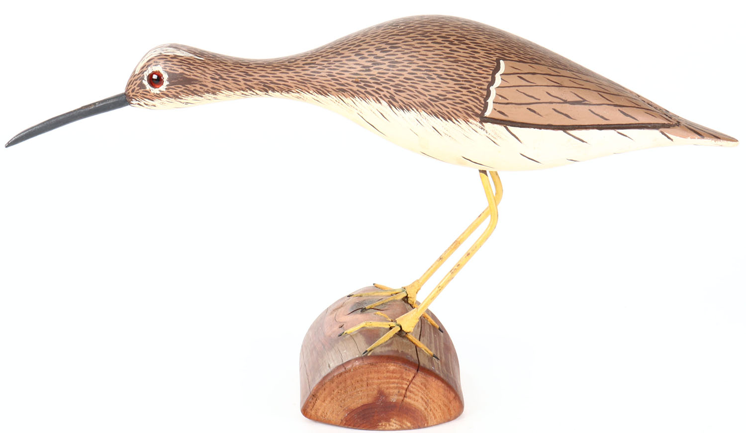 Shorebird by Wildfowler Decoys, Point Pleasant, NJ by Charles R. Birdsall, glass eyes, solid wood on wood stand, original paint, structurally excellent, stamped and signed on bottom. Grade: Excellent - Value: 50 to 100