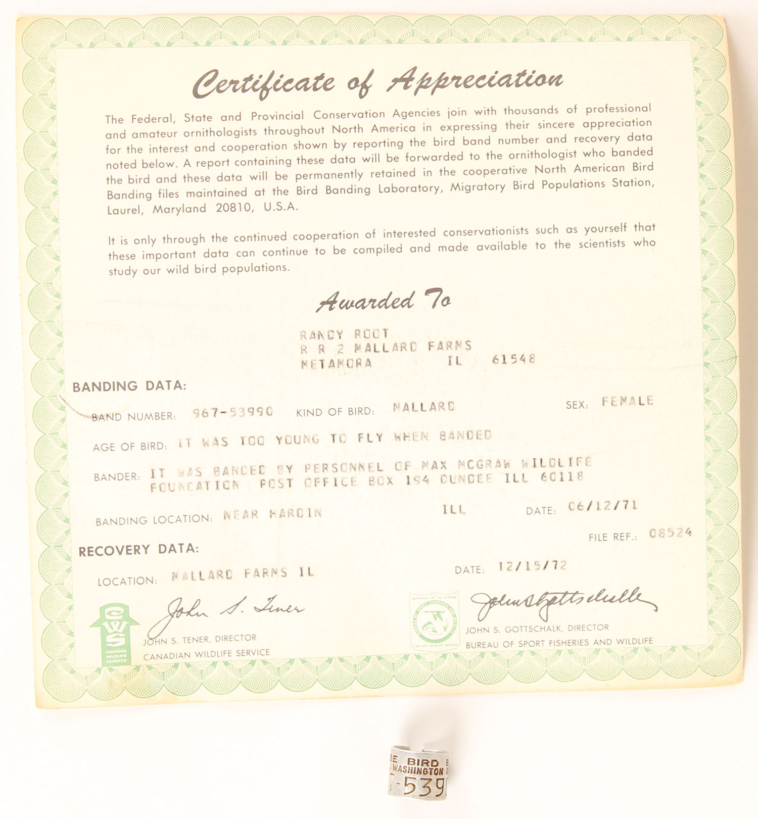 DUCK BAND with certificate from 1966, we are offering a few duck bands that were all shot at one duck club in Peoria IL from 1964 - 1999, ''MALLARD FARMS R R 2'', this one has a certificate, this one was banded in Near Kardin ILL 06/12/1971 and shot 12/15/1972. Grade: Excellent - Value: 30 to 100