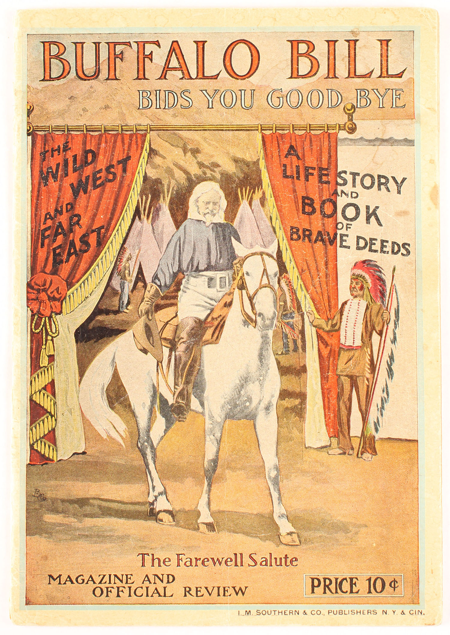 Buffalo Bill Bids You Good Bye: The Farewell Salute Magazine and Official Review, 10'' x 6 7/8''. Pages clean, staplebound, cover has stains and a few rips. Grade: Very Good ++ - Value: 10 to 100