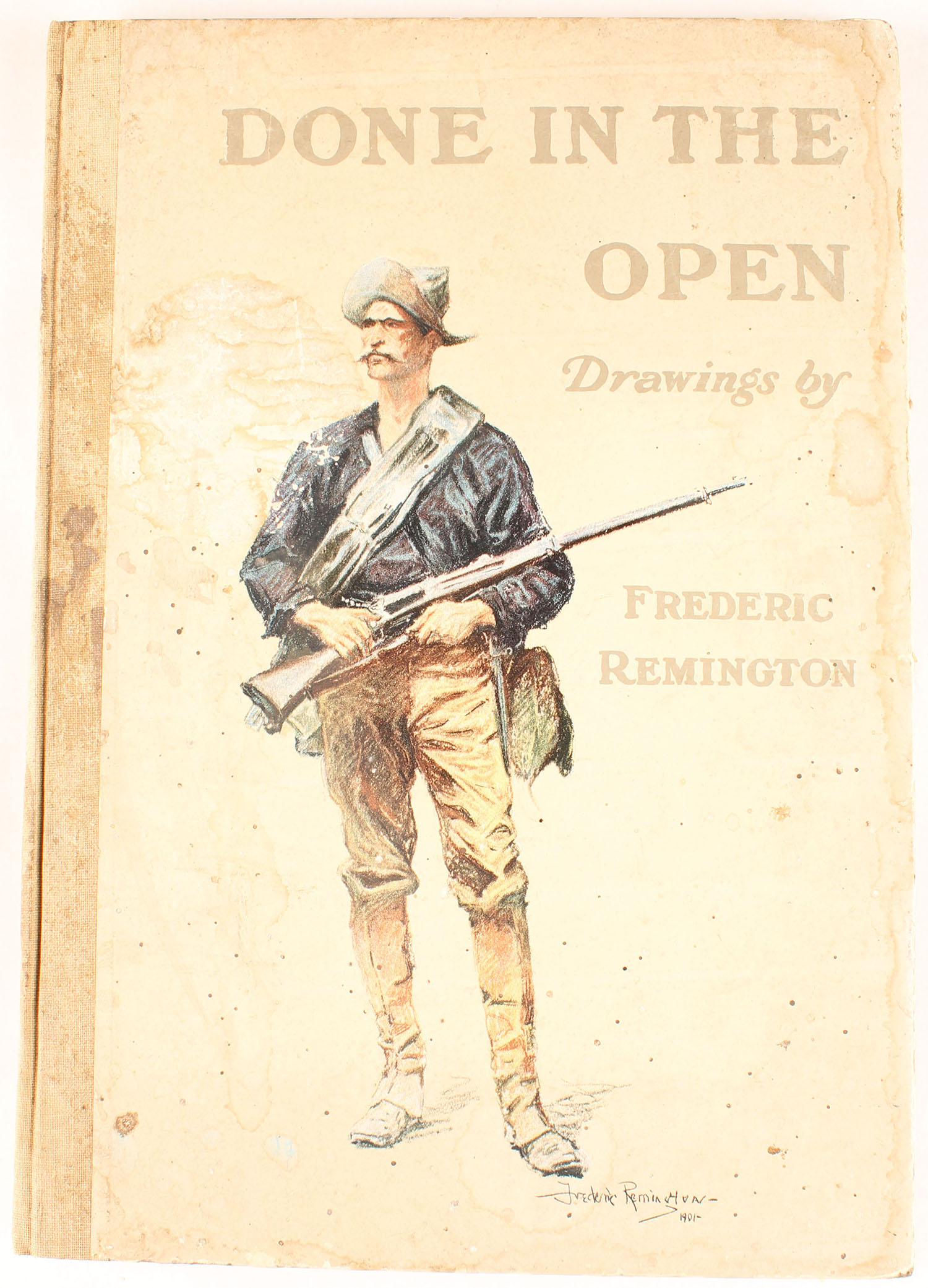 Done In The Open Drawings by Frederic Remington, 11 1/2'' x 16 1/2''. Pages clean, binding is slightly loose, b/w images. Value: $500 Grade: Very Good ++ - Value: 50 to 500