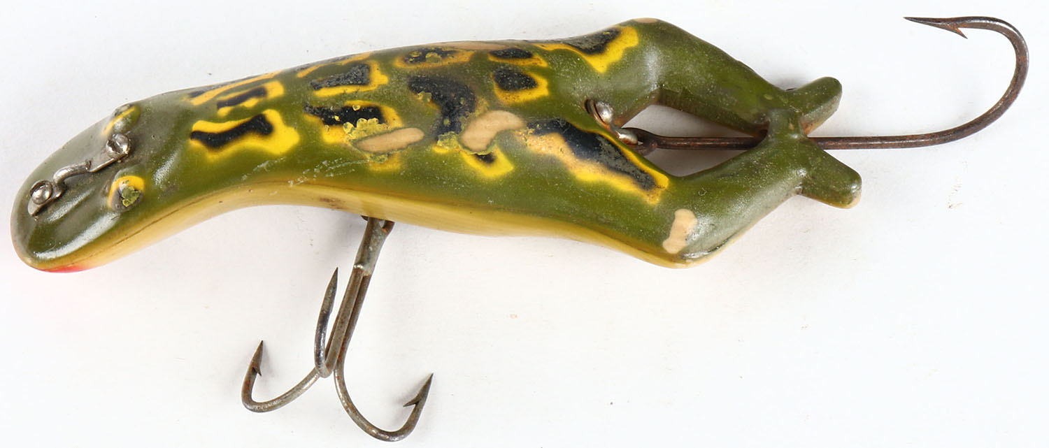 Heddon LUNY FROG with open legs, 2 hook lure, frog pattern, has painted eyes, paint is nice with light wear. Grade: Excellent - Value: 40 to 150