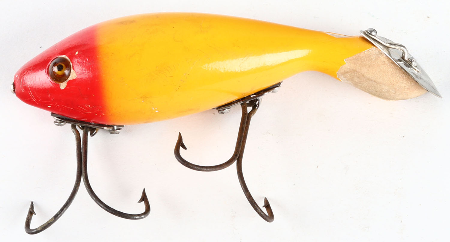 Heddon Tadpolly #5000, wood lure, GE, red & yellow Finish, 2 hooks, marked metal lip, 2pc hdw, 4'', some paint loos to underside. Grade: Very Good ++ - Value: 50 to 75