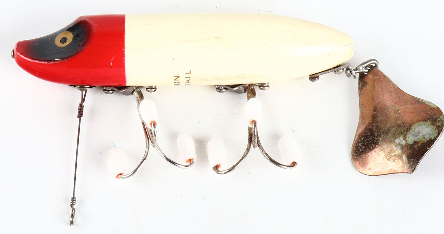 Heddon Flaptail Vamp, wood lure, PE, red & white, 2 hooks, marked belly, surface rig, 4'', near mint. Grade: Excellent ++ - Value: 60 to 90