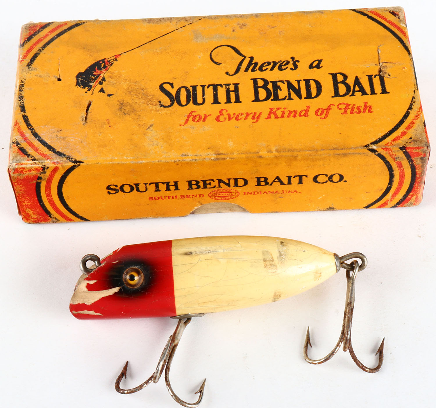 South Bend Bass-Oreno wood lure in original boxed marked 952RW, red & White lure, GE, 2 hooks, cup rig, lure shows paint chips to head, box is solid. Grade: Very Good - Value: 10 to 30