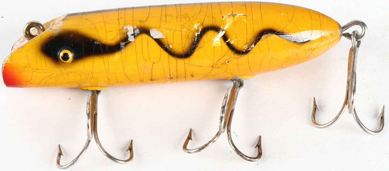 South Bend Bass-Oreno wood lure, yellow with black stripe, TE, 3 hooks, cup rig, show some crazing & light scuffing to one side. Grade: Excellent - Value: 10 to 50