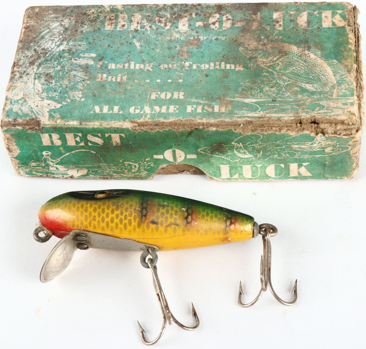 Best-O Luck lure in the original box, green & yellow scale, GW, 2 hooks, shows some chipping to paint. Grade: Very Good - Value: 2 to 30