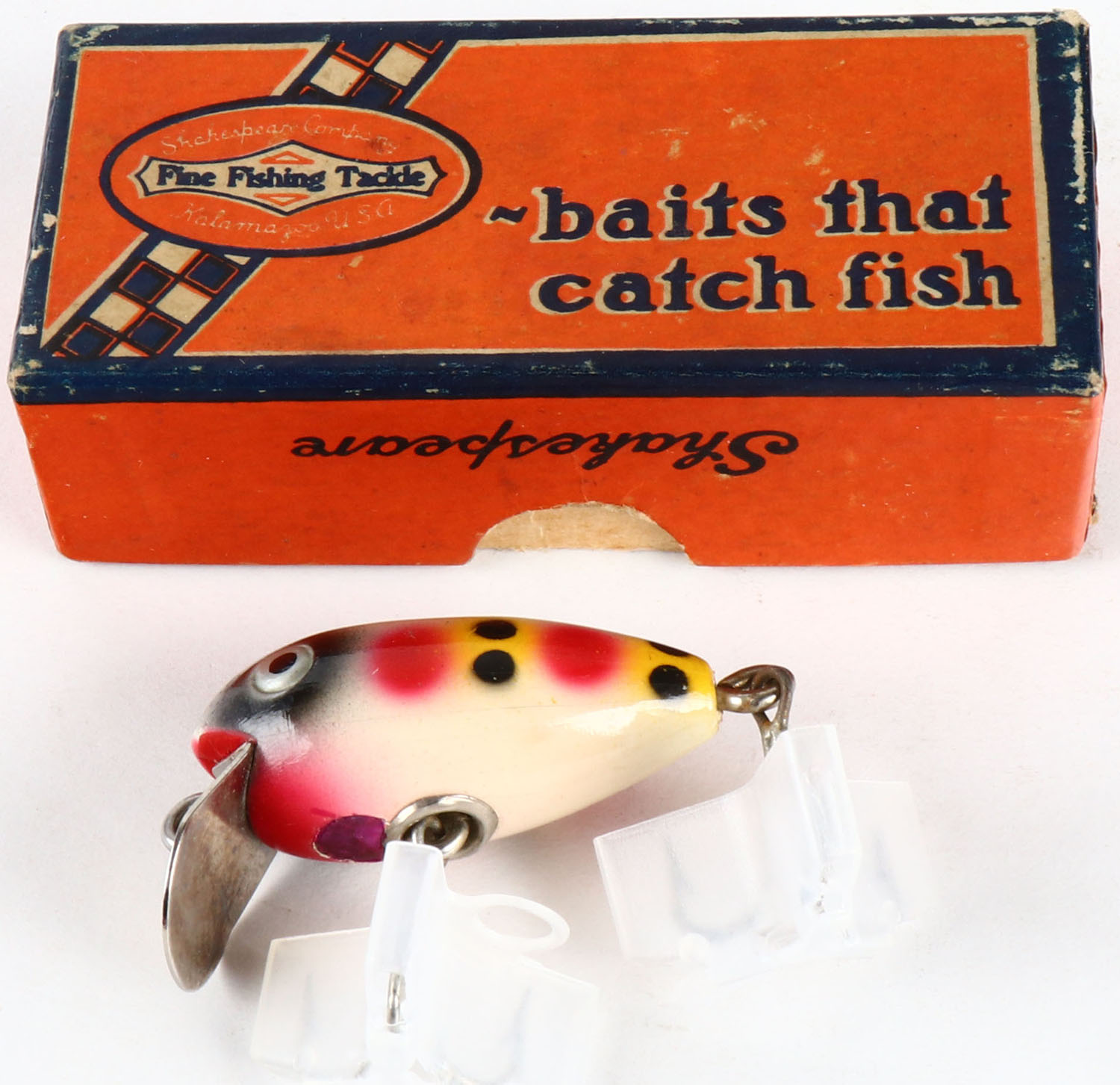 Shakespeare Grumpy No 6602 in original box, Strawberry finish, CE, 2 hooks. Grade: Excellent ++ - Value: 10 to 30