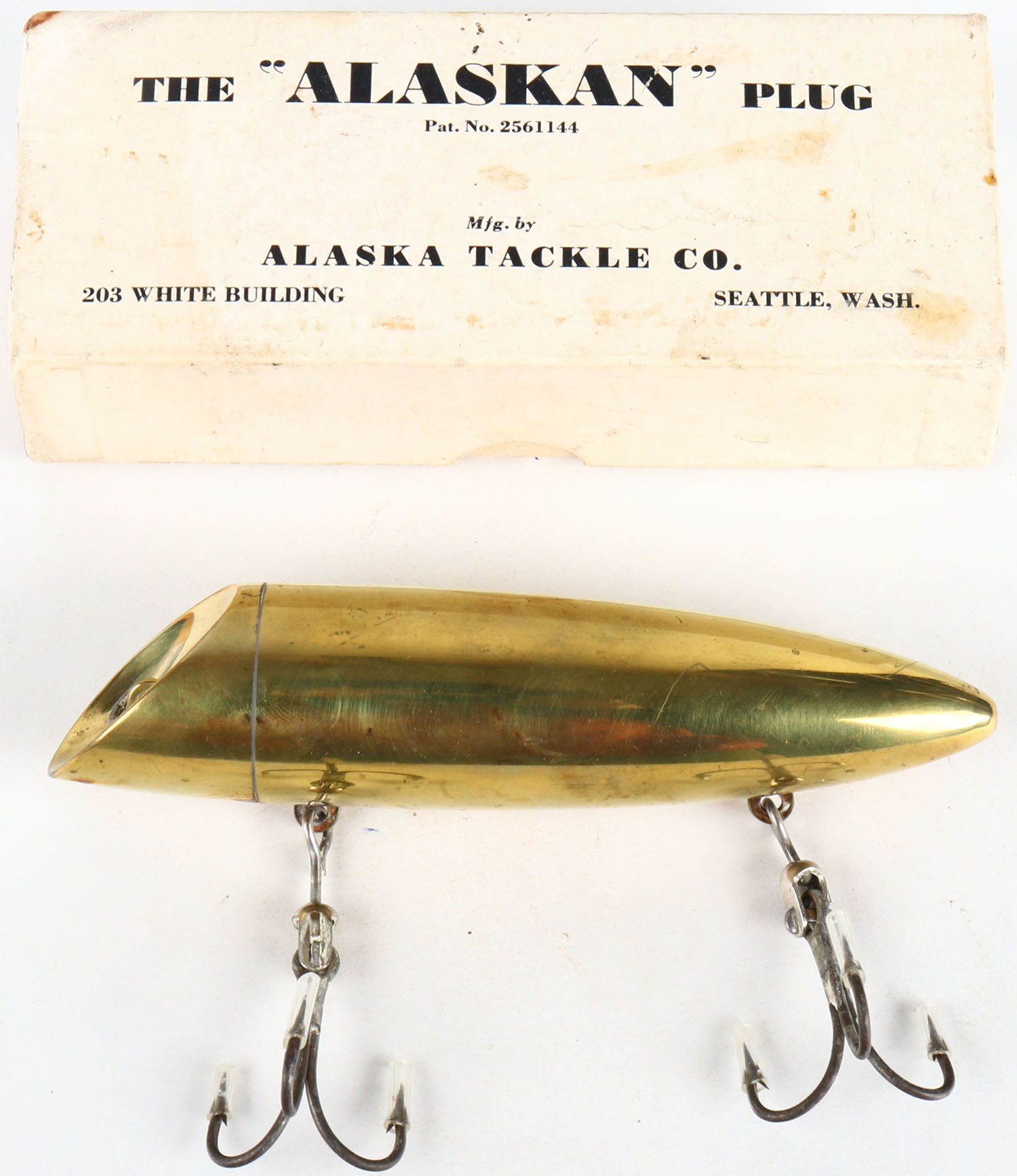 Alaskan Salmon Plug in original box, no eyes, BRASS finish. Grade: Excellent ++ - Value: 20 to 60