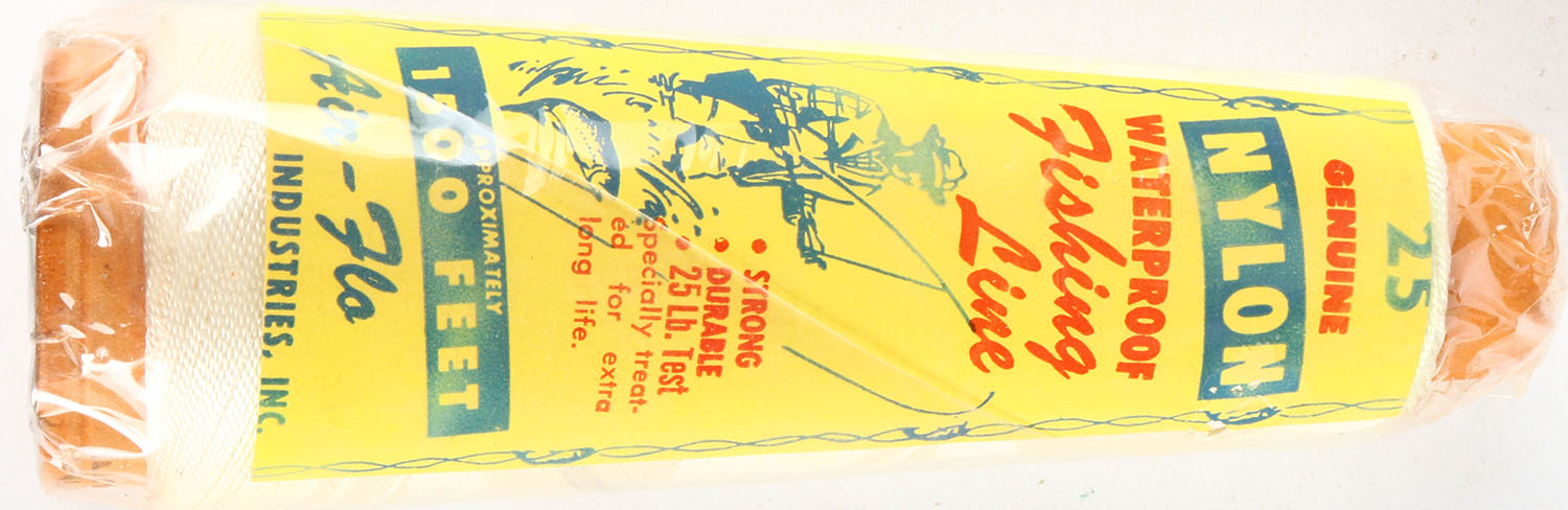 Air-Flo Genuine NYLON waterproof Fishing Line, 1500 feet, sealed in original wrapping, has nice fishing scene on label. Grade: MINT - Value: 6 to 30