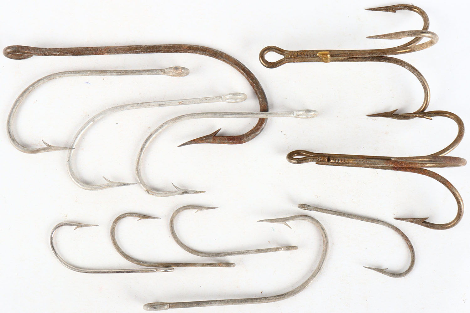 | Lot of large hooks, treble hooks are 3'' long. Grade: Excelle...
