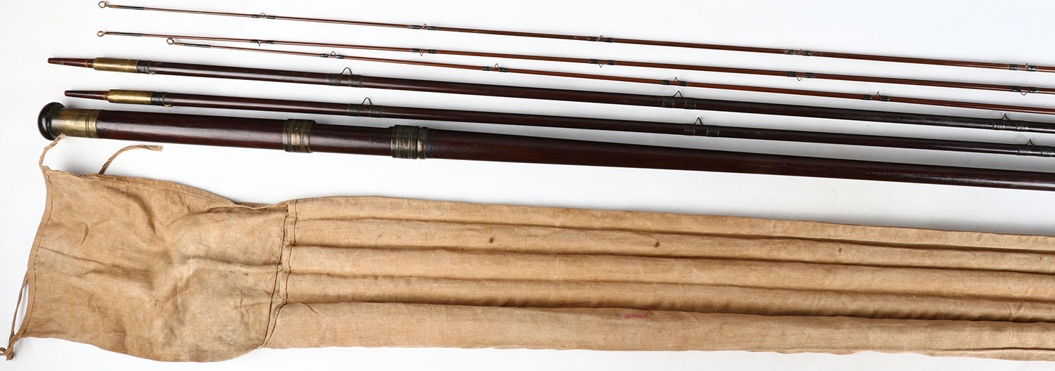 RARE and in amazing condition!!! Forrest Maker Kelso spey salmon rod. He was Scotland's most recognizes fly rod make in the mid 19th century. In 1895 with this same style rod Alexander Grant made a spey cast of 65 yards in calm conditions which was a world record until bested in 2005 by a modern graphite rod with PVC line. The rod is made of Scotland's Greenheart wood and heavy brass. It has one butt, two mid sections and three tips. Assembled length is 15 feet. The butt is 64 1/2'', midsections are 60 3/4'', tips are 59 1/2''. Every eye and wrap is excellent. The brass fittings are perfect with wonderful patina. The rod has three Ferrule plugs and original rod bag. Grade: Excellent ++ - Value: 300 to 2000