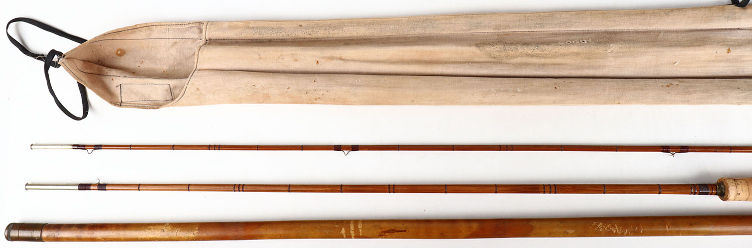 | Unmarked custom made split bamboo fly rod, 3/2 in blue rod bag, ...
