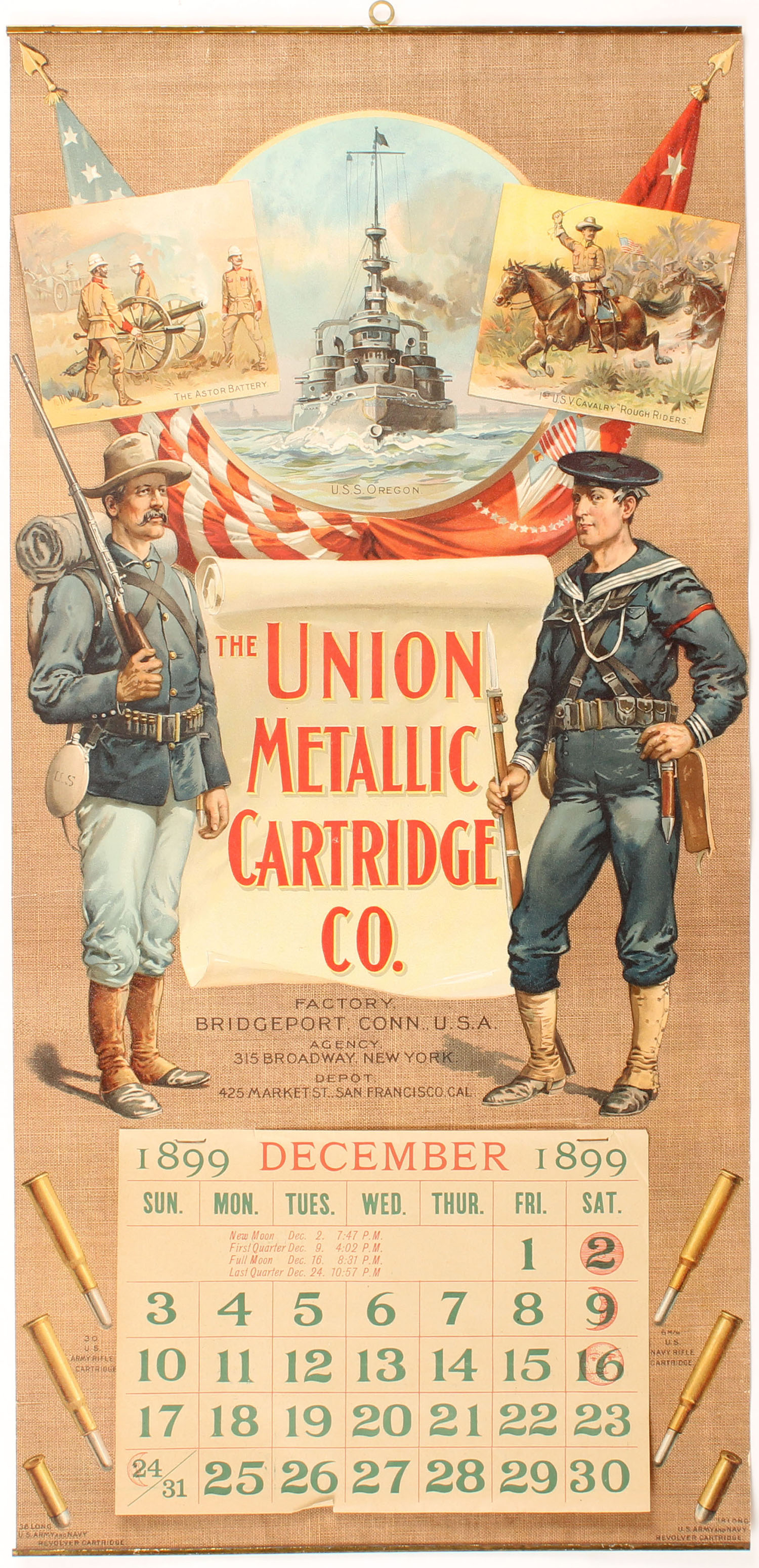 RARE 1899 UMC Co. Calendar pictures many great full color images, the USS OREGON, The Astor Battery, US Calvary Rough Riders plus two large images of Army & Navy US Solders, 13 1/2'' x 28'', has metal bands top & bottom with brass hanger, has Dec. page, has no edge wear with near perfect colors. Grade: Excellent ++ - Value: 800 to 2000