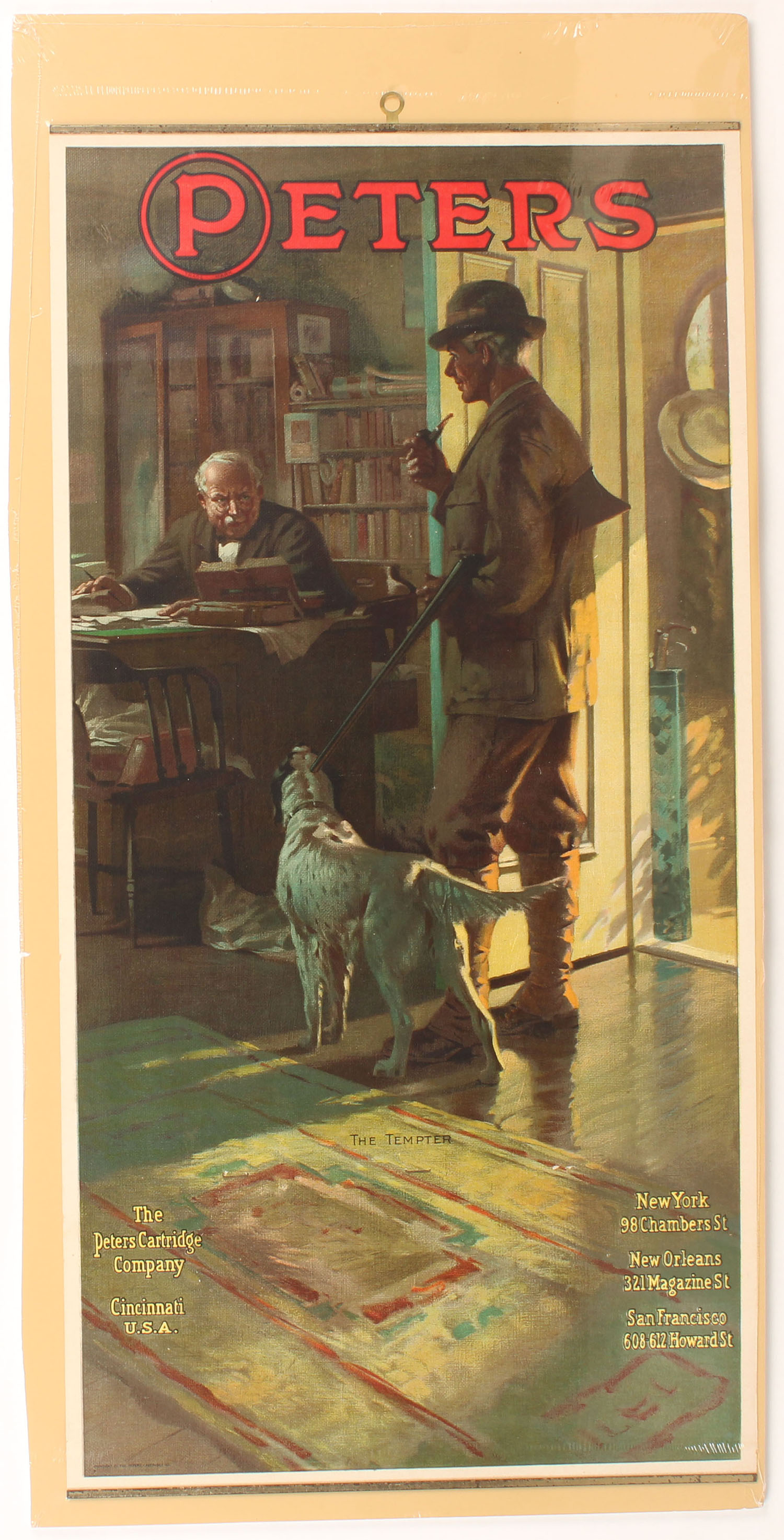1912 Peters calendar, ''THE TEMPTER'', full color image of hunter asking a judge to skip out of work & go hunting, has metal bands top & bottom with brass hanger, no pages, 13 3/4'' x 27'', has no wear with great colors. Grade: Excellent + - Value: 1000 to 2000