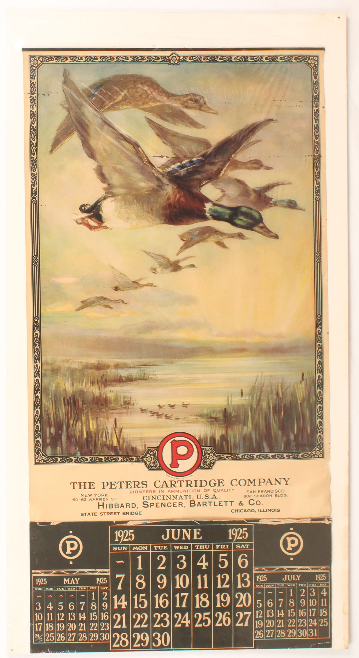 1925 Peters Calendar, has great fall image of mallards flying over decoy sin marsh grass, has band on top with no brass hanger, June - Dec Pages, 15'' x 29 3/4'', calendar has two lines at top that look like stain lines otherwise great colors, no edge wear. Grade: Excellent - Value: 800 to 1600